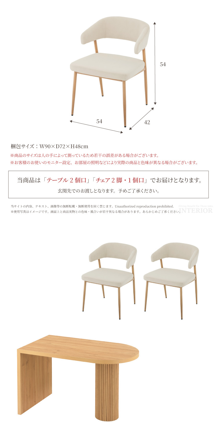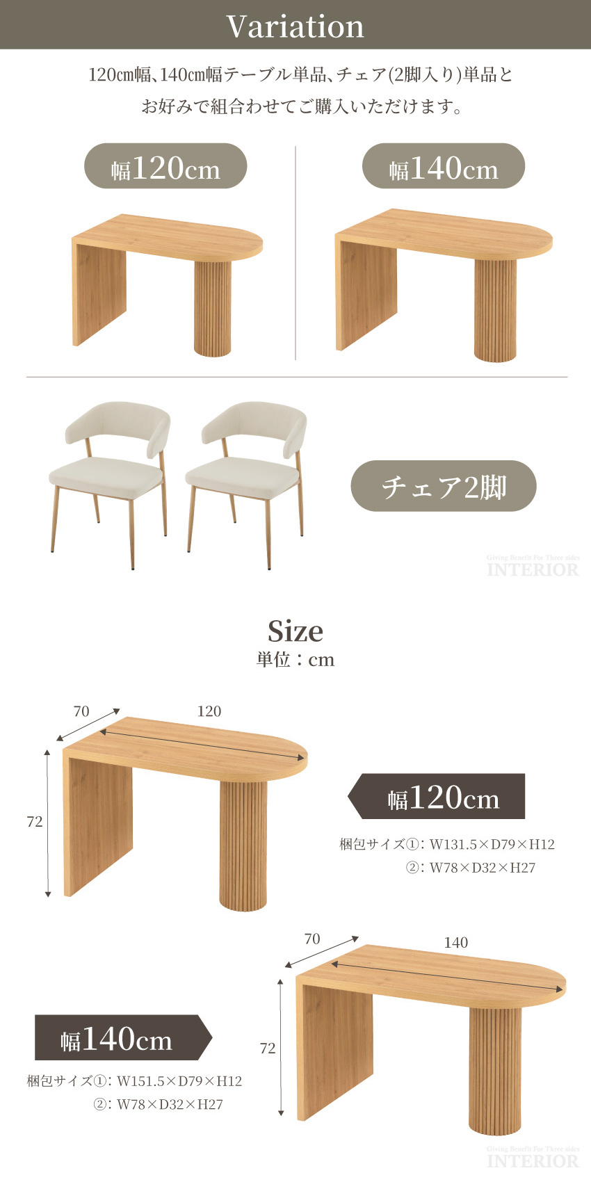 | 120cmテーブル:幅120×奥行70×高さ72cm 梱包サイズ(1):幅131.5×奥行79×高さ12cm/(2):幅78×奥行32×高さ27cm 140cmテーブル:幅140×奥行70×高さ72cm 梱包サイズ(1):幅151.5×奥行79×高さ12cm/(2):幅78×奥行32×高さ27cm チェア:幅54×奥行42×高さ54cm 梱包サイズ:幅90×奥行72×高さ48cm | ||