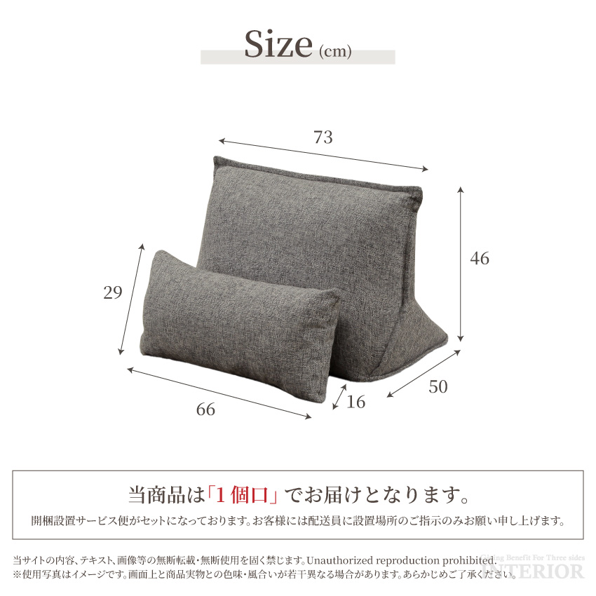 | クッション(大):W73×D50×H46 cm クッション(小):W66×D16×H29 cm 梱包サイズ:W76×D53×H49cm | ||