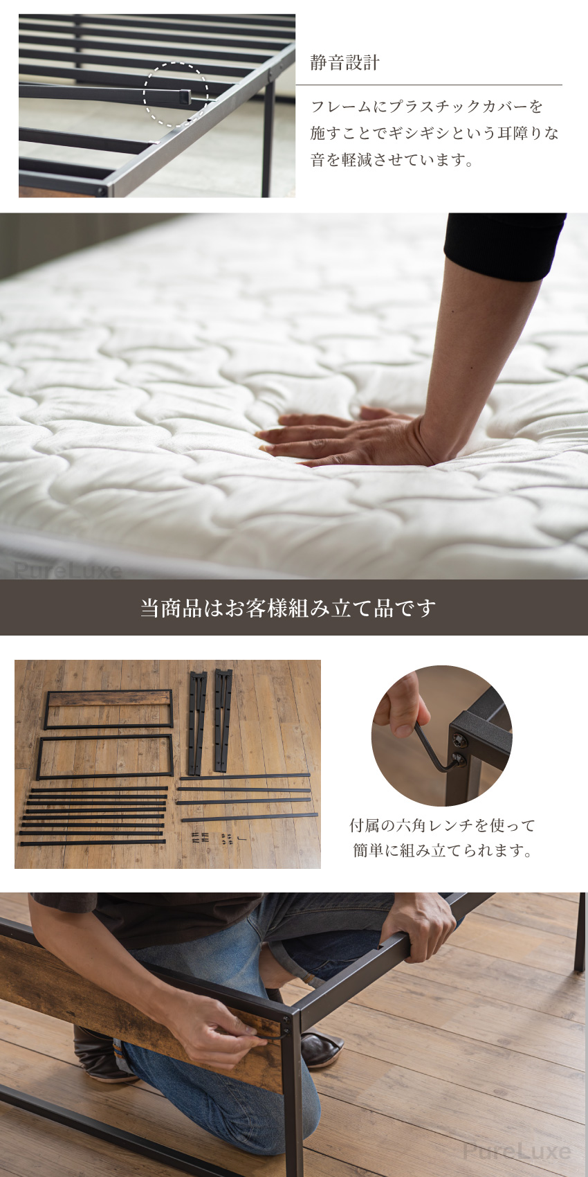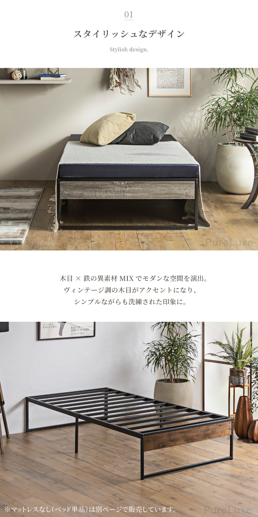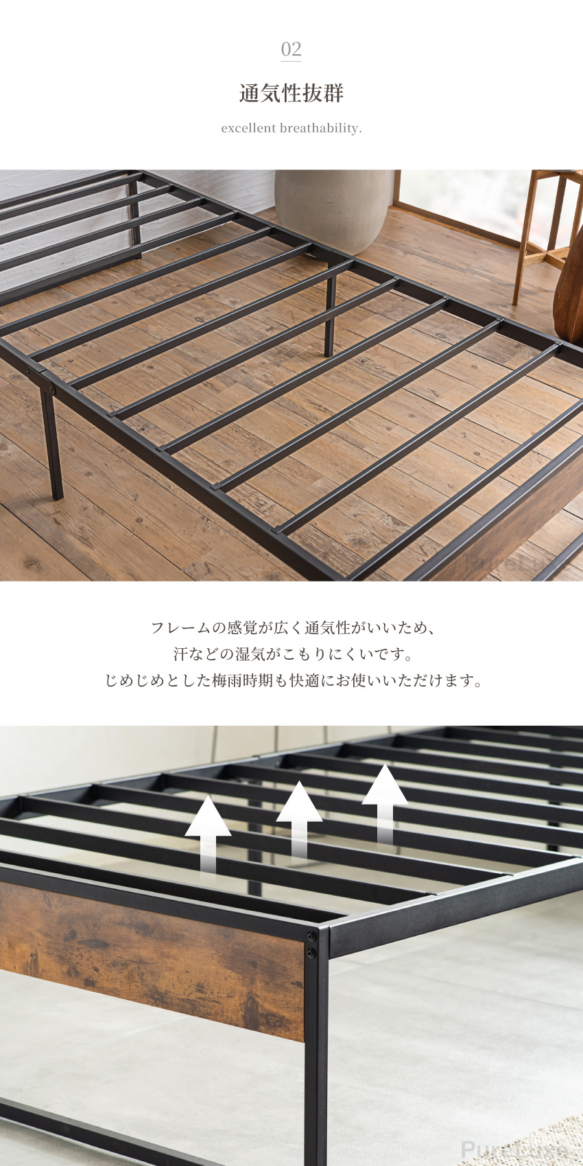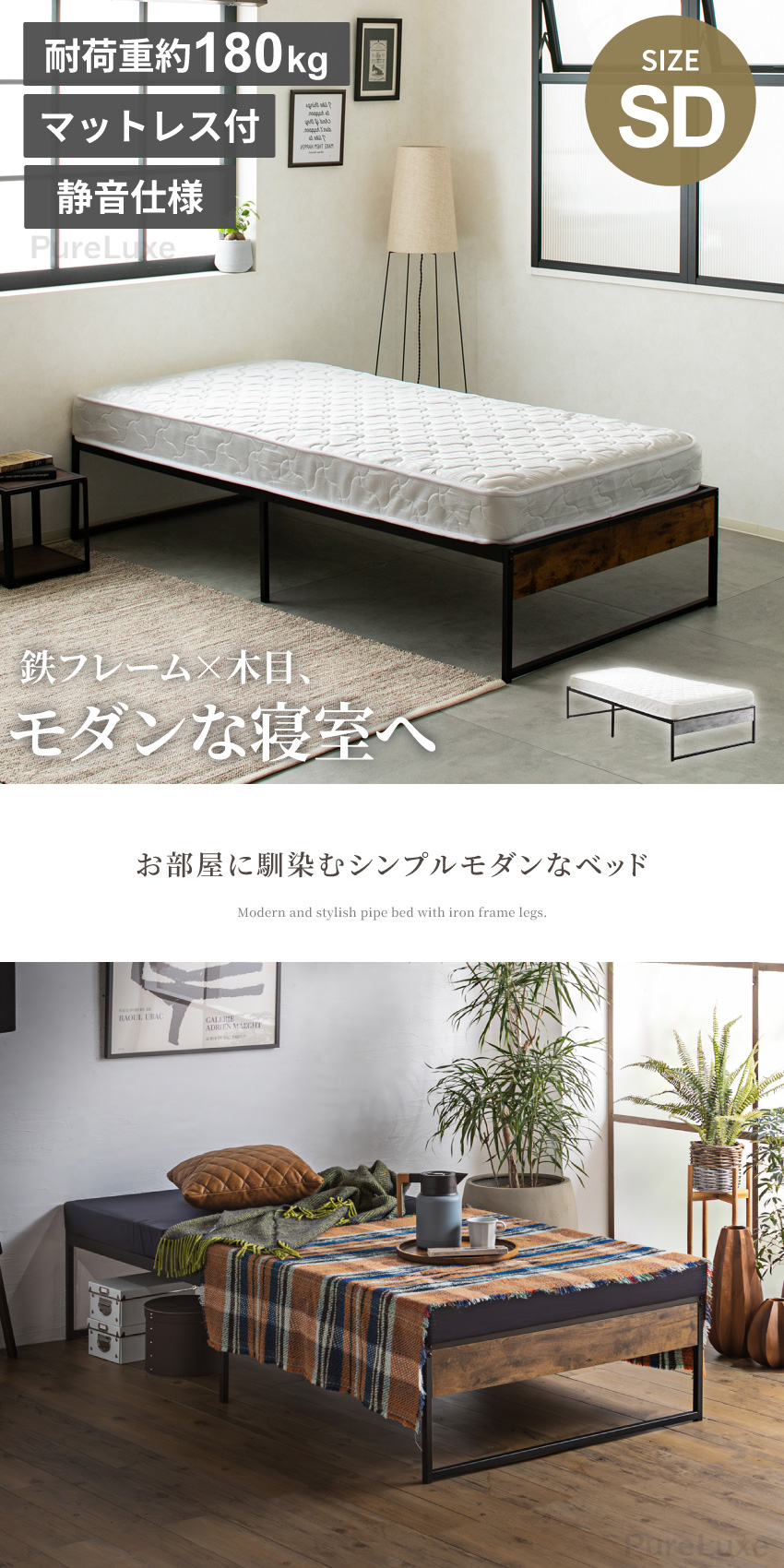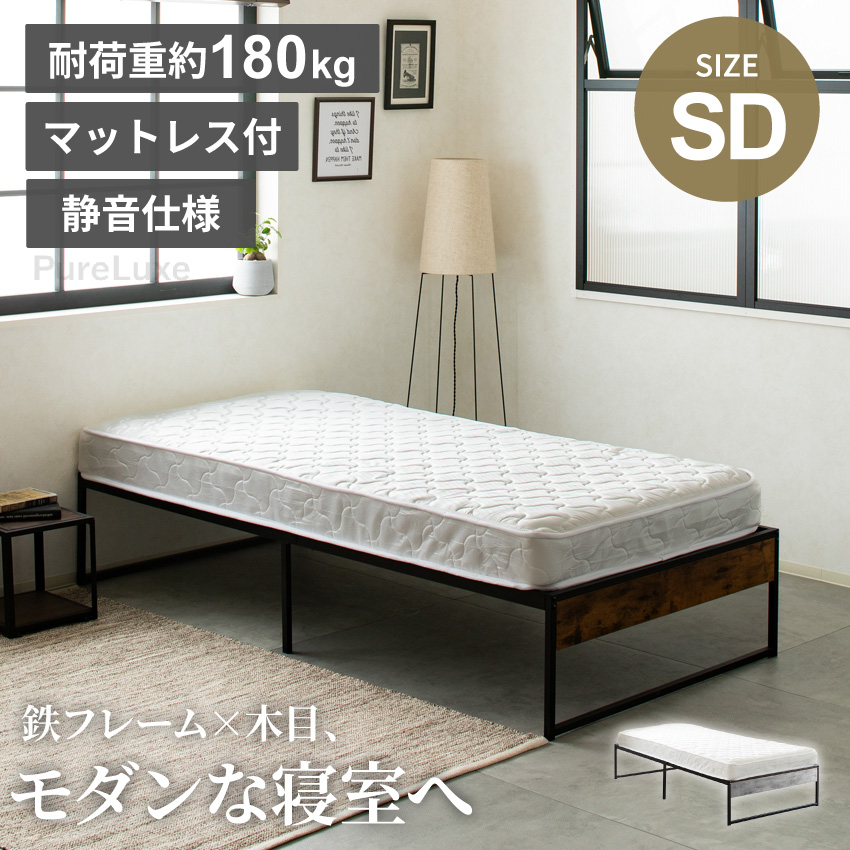| 鉄フレーム×木目のモダンなパイプベッドマットレスセット。フレーム間隔が広く、通気性に優れているため梅雨時期にも快適にご使用いただけます。頑丈な鉄フレームで体をしっかりと支えてくれ、180kgの重みにまで耐えられます。フレームにはプラスチックカバーを施していますので、ギシギシという音を軽減してくれます。 | ||