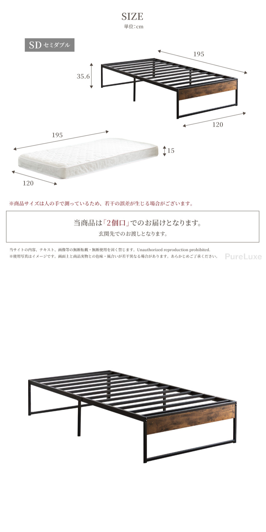 | パイプベッド:W120×D195×H35.6cm マットレス:W120×D195×H15cm | ||