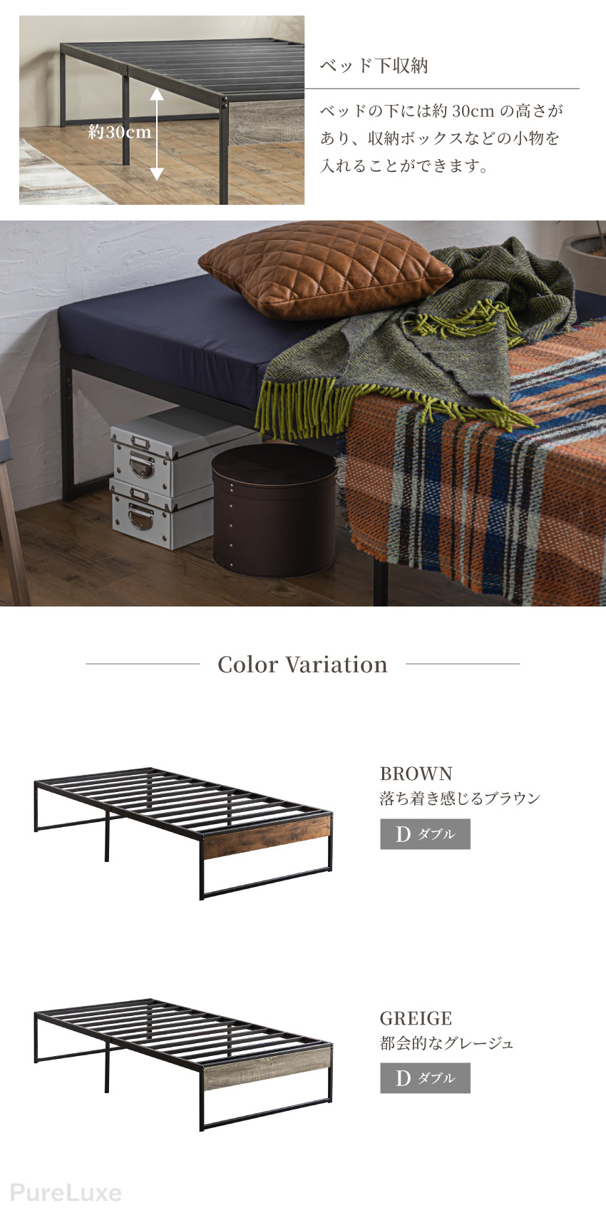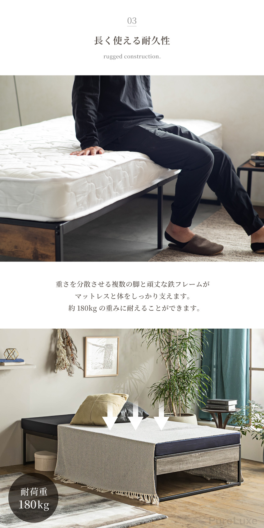 | 鉄フレーム×木目のモダンなパイプベッドマットレスセット。フレーム間隔が広く、通気性に優れているため梅雨時期にも快適にご使用いただけます。頑丈な鉄フレームで体をしっかりと支えてくれ、180kgの重みにまで耐えられます。フレームにはプラスチックカバーを施していますので、ギシギシという音を軽減してくれます。 | ||