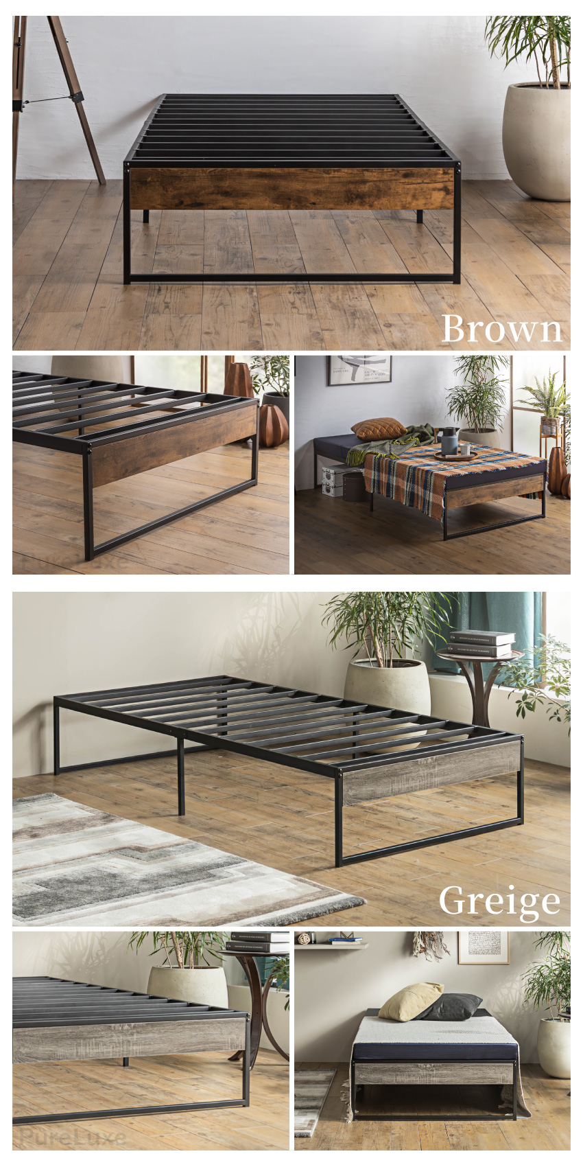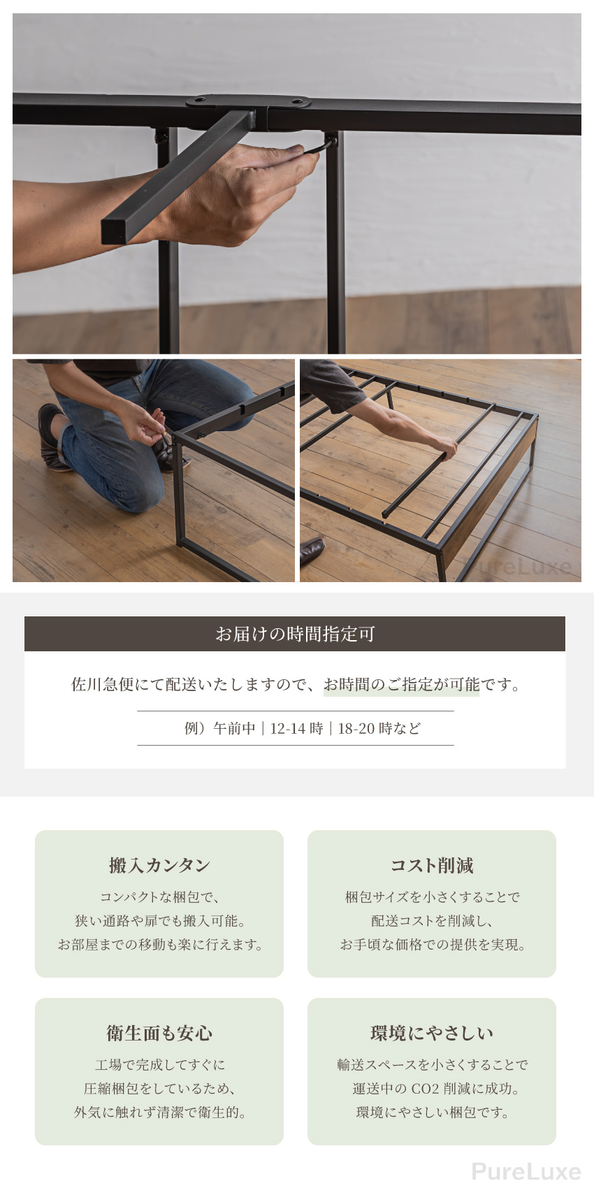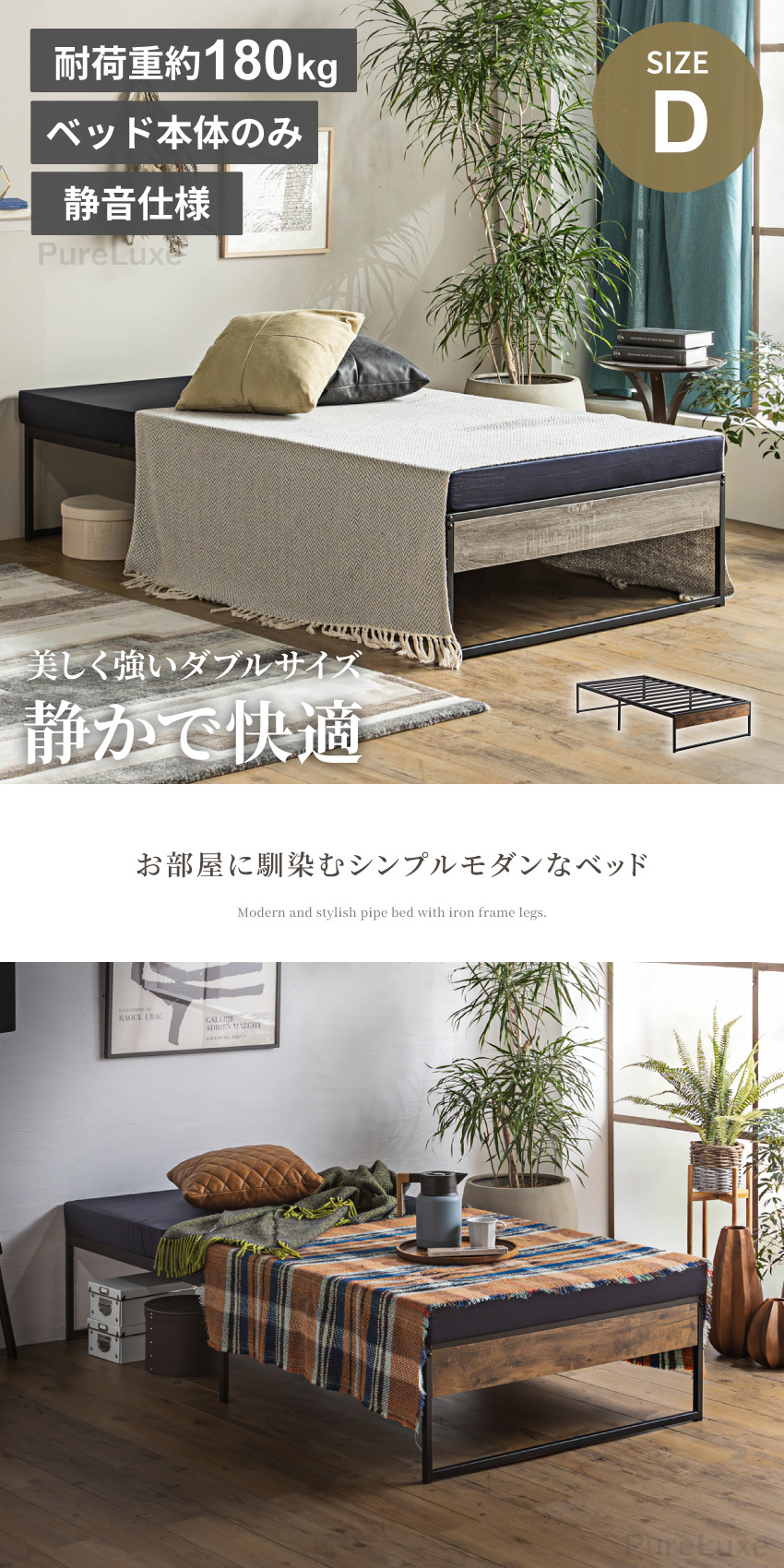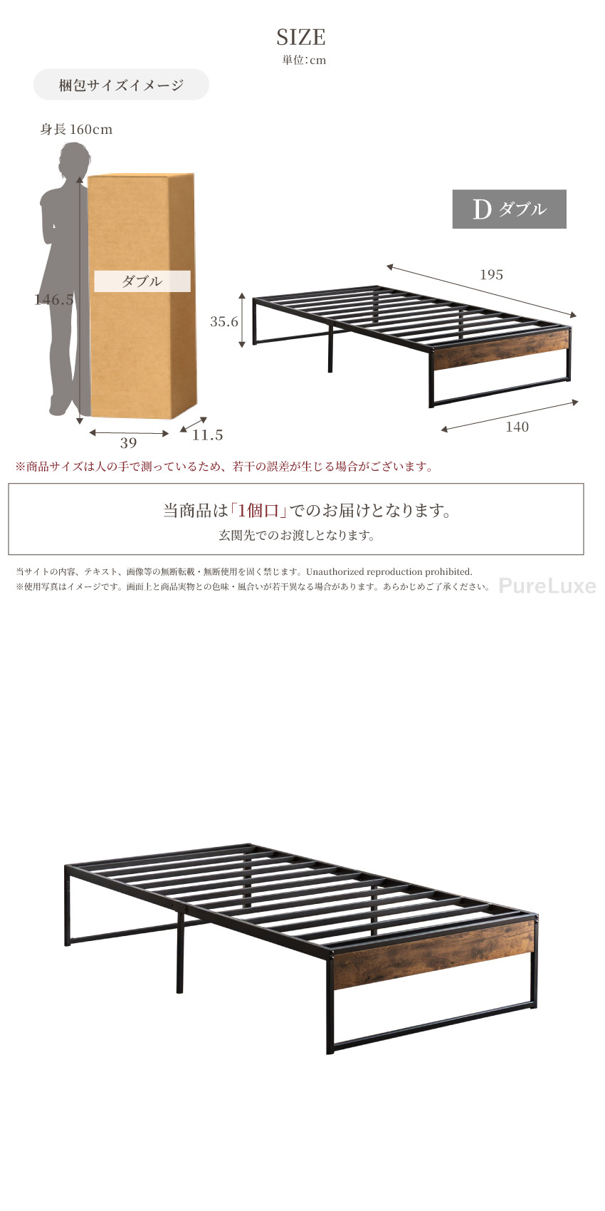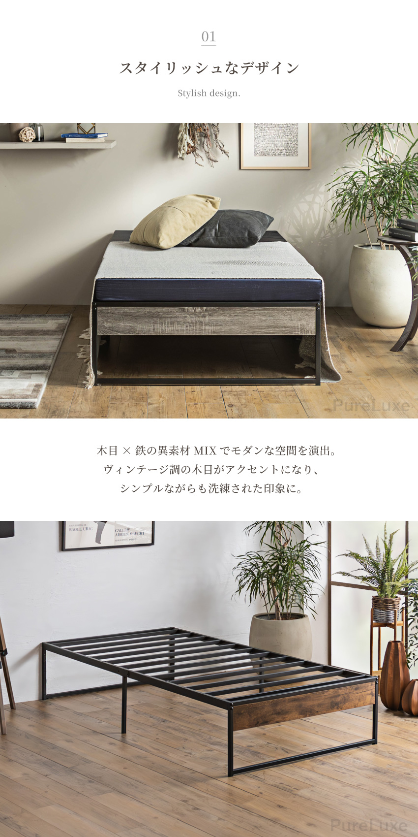 | 鉄フレーム×木目のモダンなパイプベッド。フレーム間隔が広く、通気性に優れているため梅雨時期にも快適にご使用いただけます。頑丈な鉄フレームで体をしっかりと支えてくれ、180kgの重みにまで耐えられます。フレームにはプラスチックカバーを施していますので、ギシギシという音を軽減してくれます。 | ||