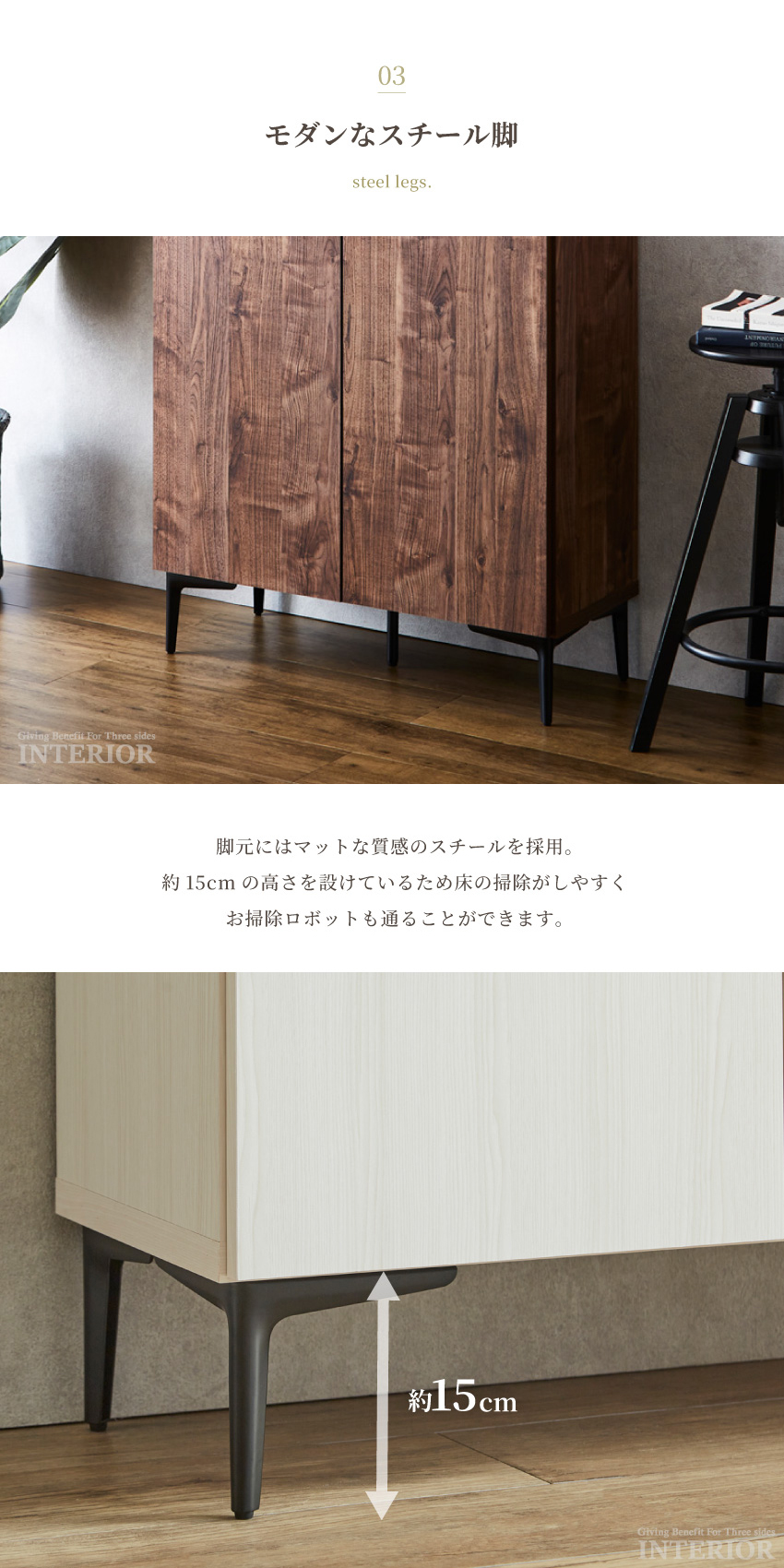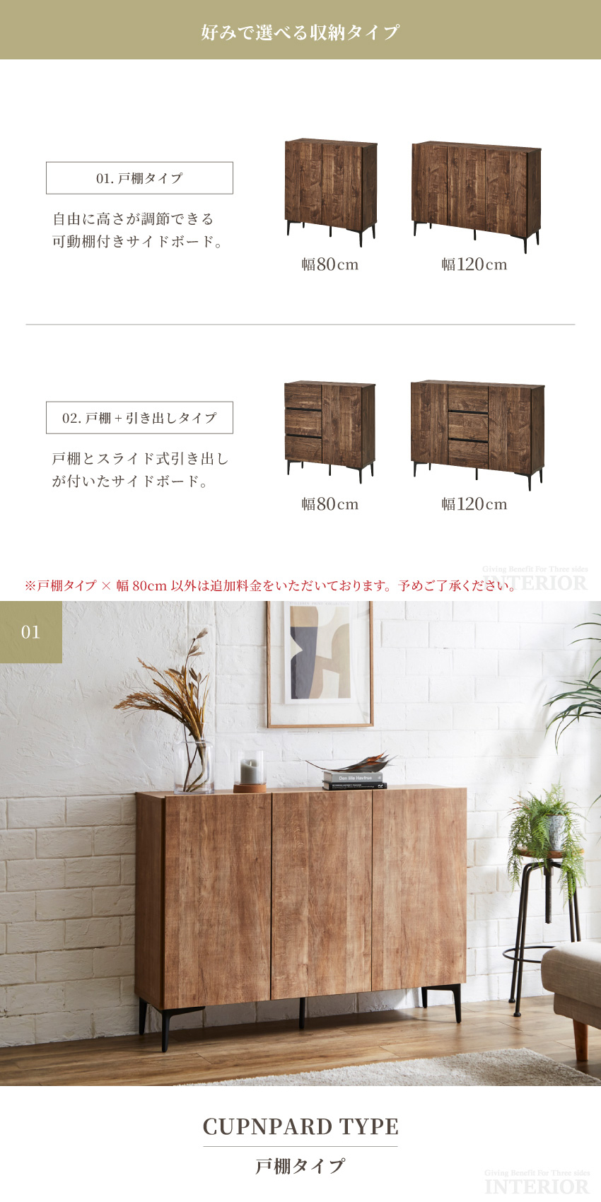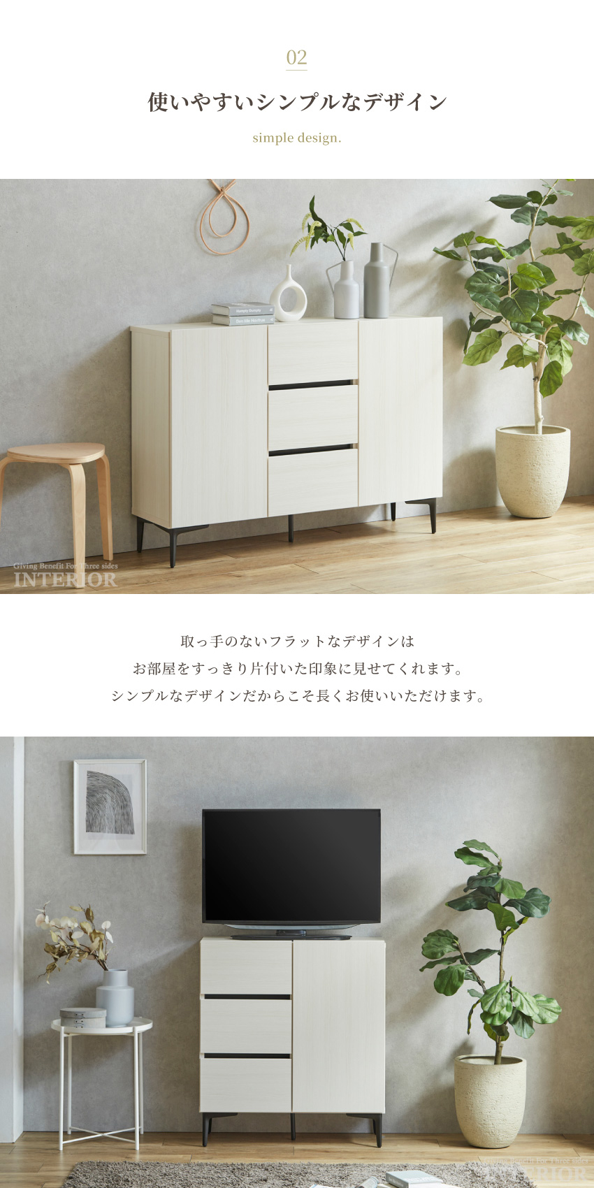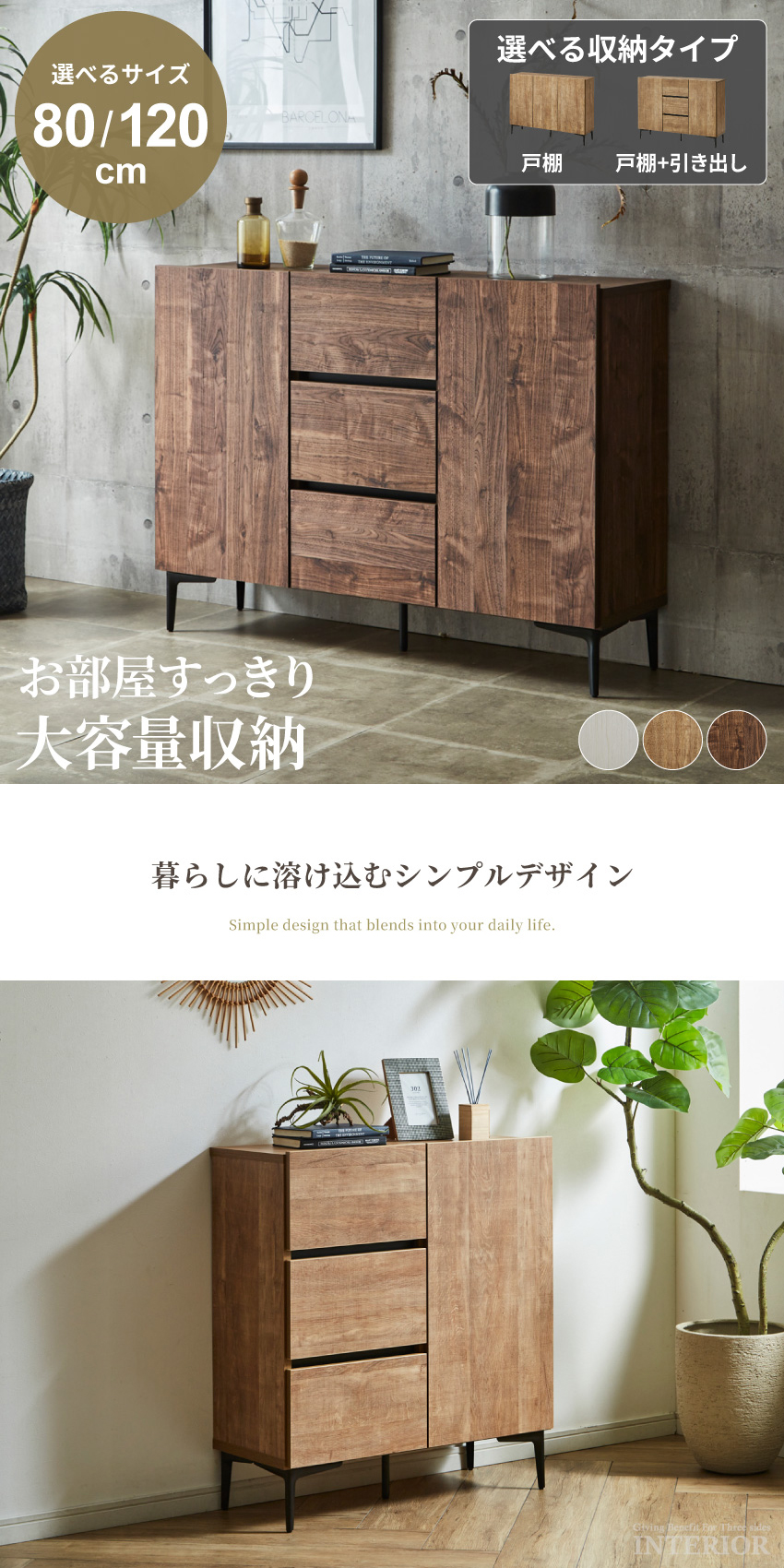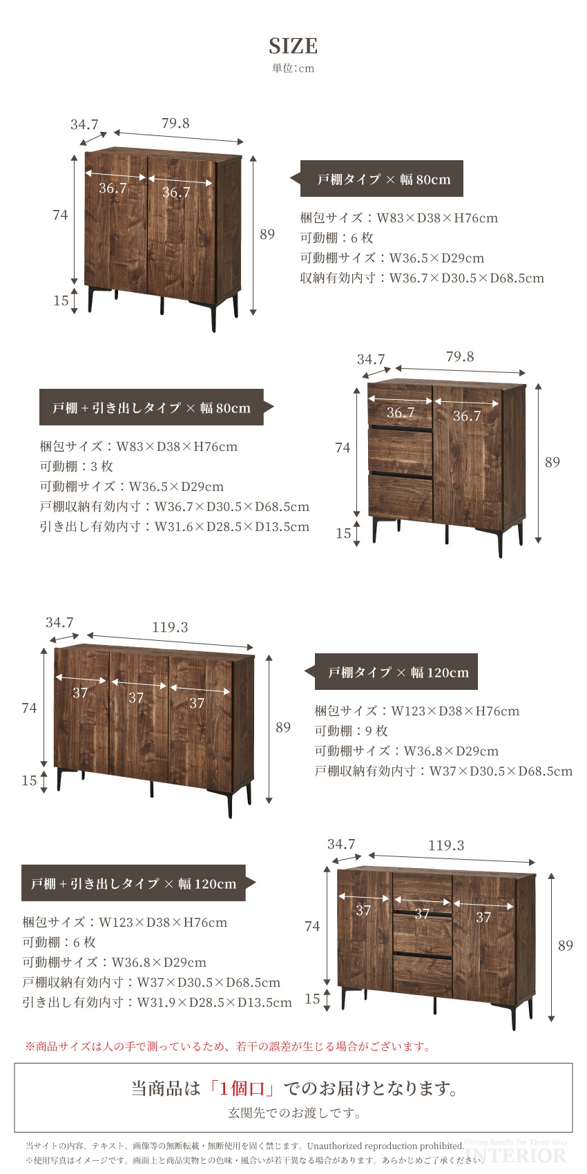 | 80cmサイズ:W79.8×D34.7×H89cm 80cm梱包サイズ:W83×D38×H76cm 120cmサイズ:W119.3×D34.7×H89cm 120cm梱包サイズ:W123×D38×H76cm 脚高:15cm | ||
