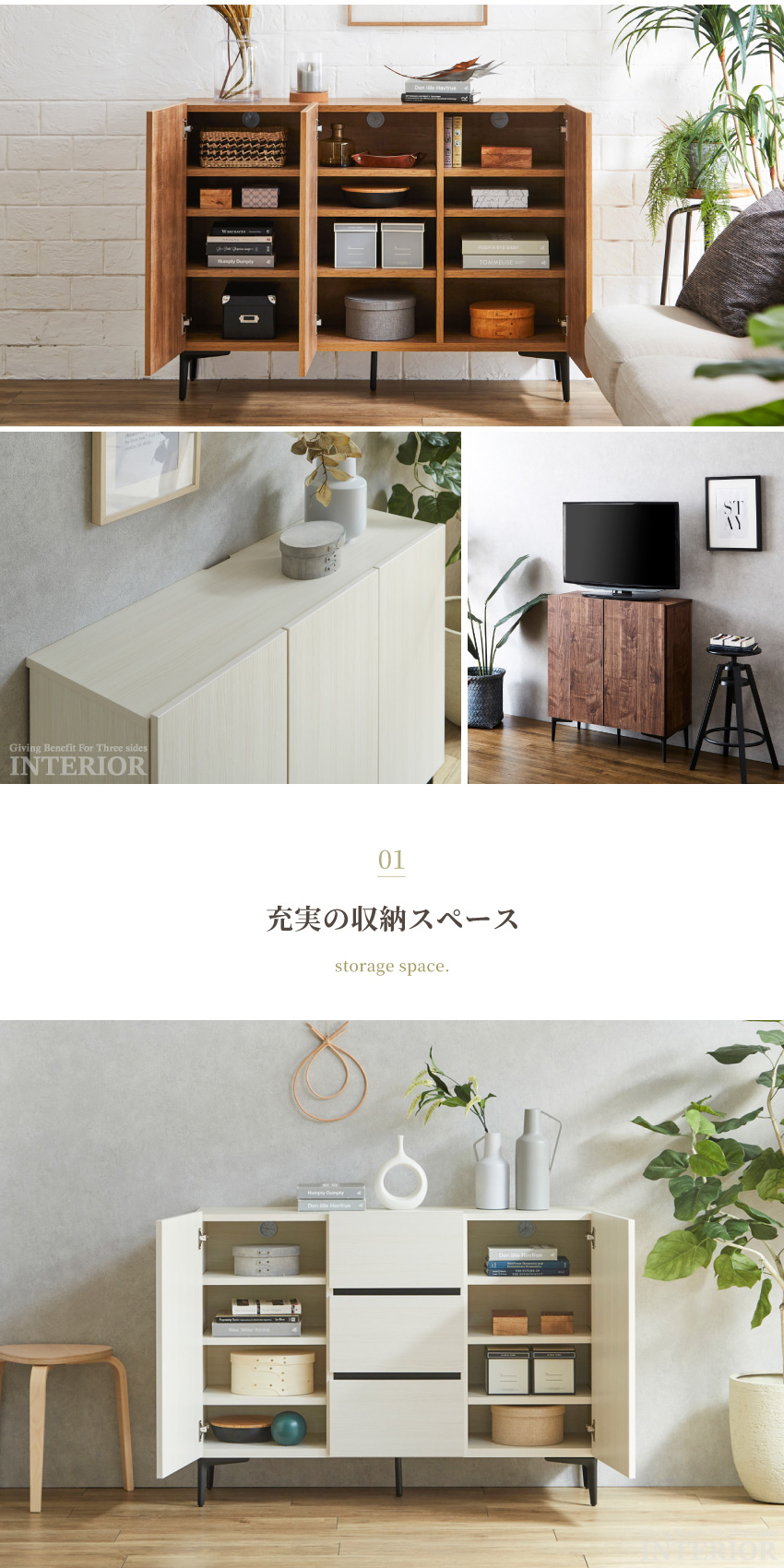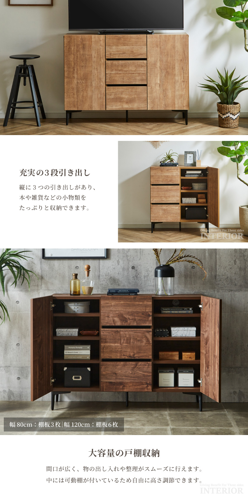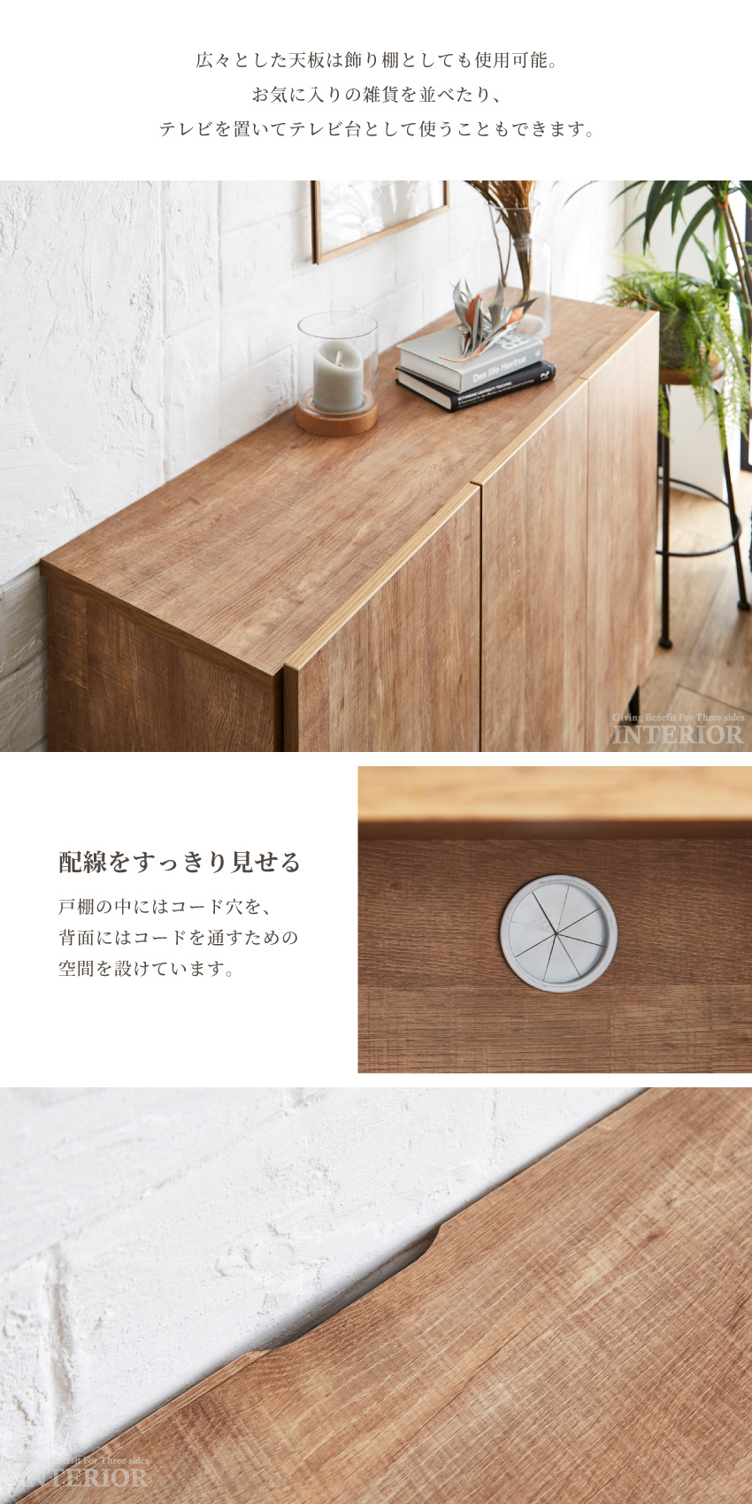 | ヴィンテージ調の木目柄が魅力のサイドボード。洗練されたシンプルなデザインは、どんなテイストのお部屋にも馴染みます。可動棚が備わっているため、物に合わせて高さ調節可能。扉はソフトクローズ仕様のため、安心してお使いいただけます。カラー・サイズ・収納タイプ、豊富なバリエーションをご用意しておりますので、きっとお気に入りが見つかるはず! | ||