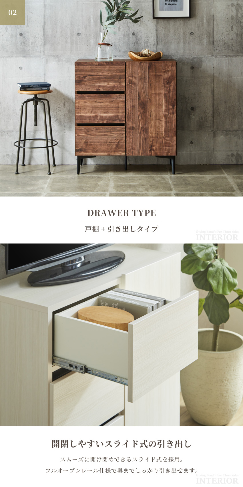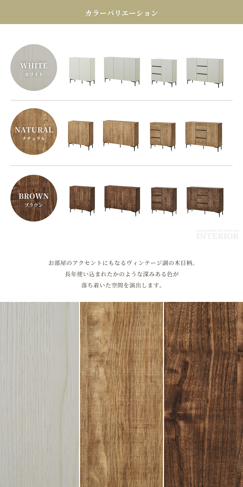 | 材質:強化紙 ブラウン:オイル仕上げ調、ナチュラル:ヴィンテージ調 引き出し:フルオープンレール仕様、ホワイトラッピング仕様(内部) 脚部:スチール製 | ||