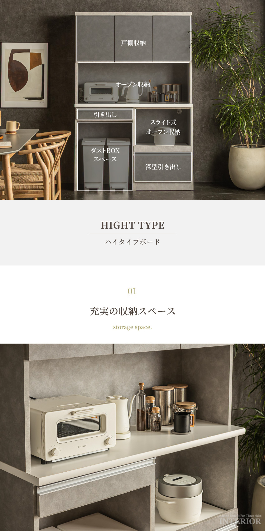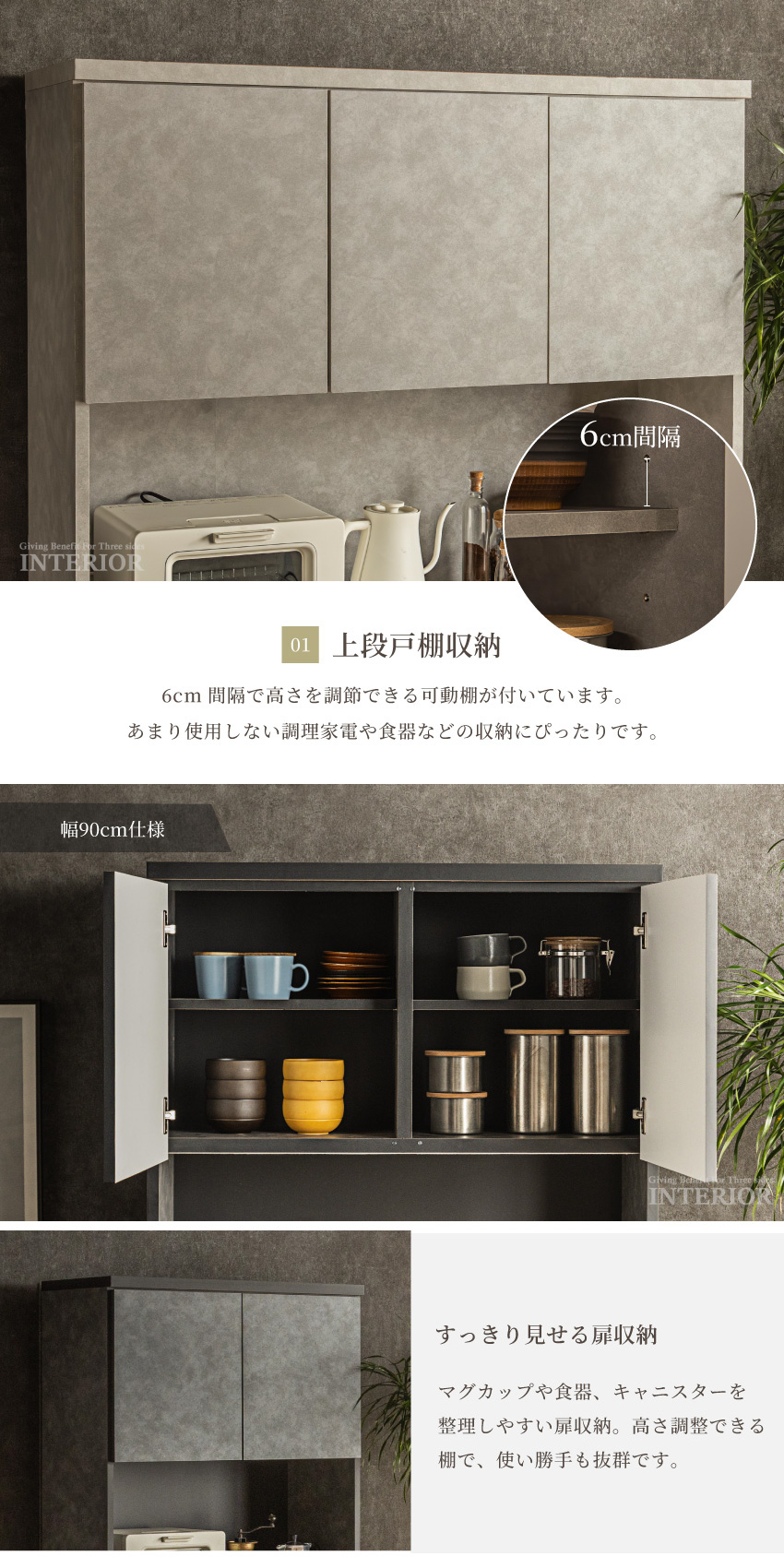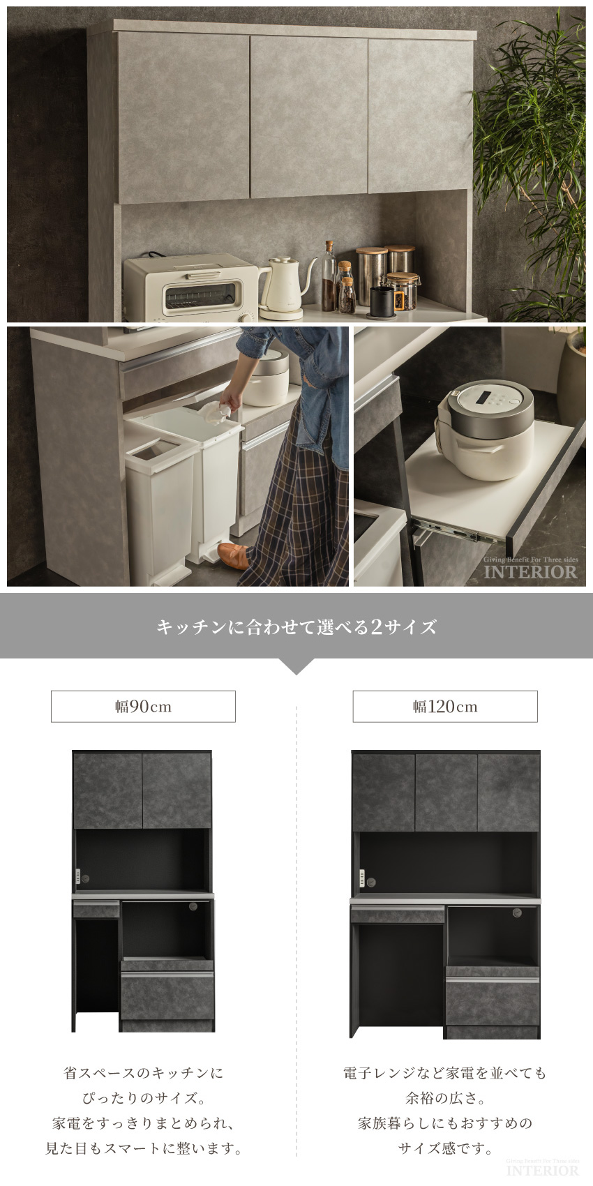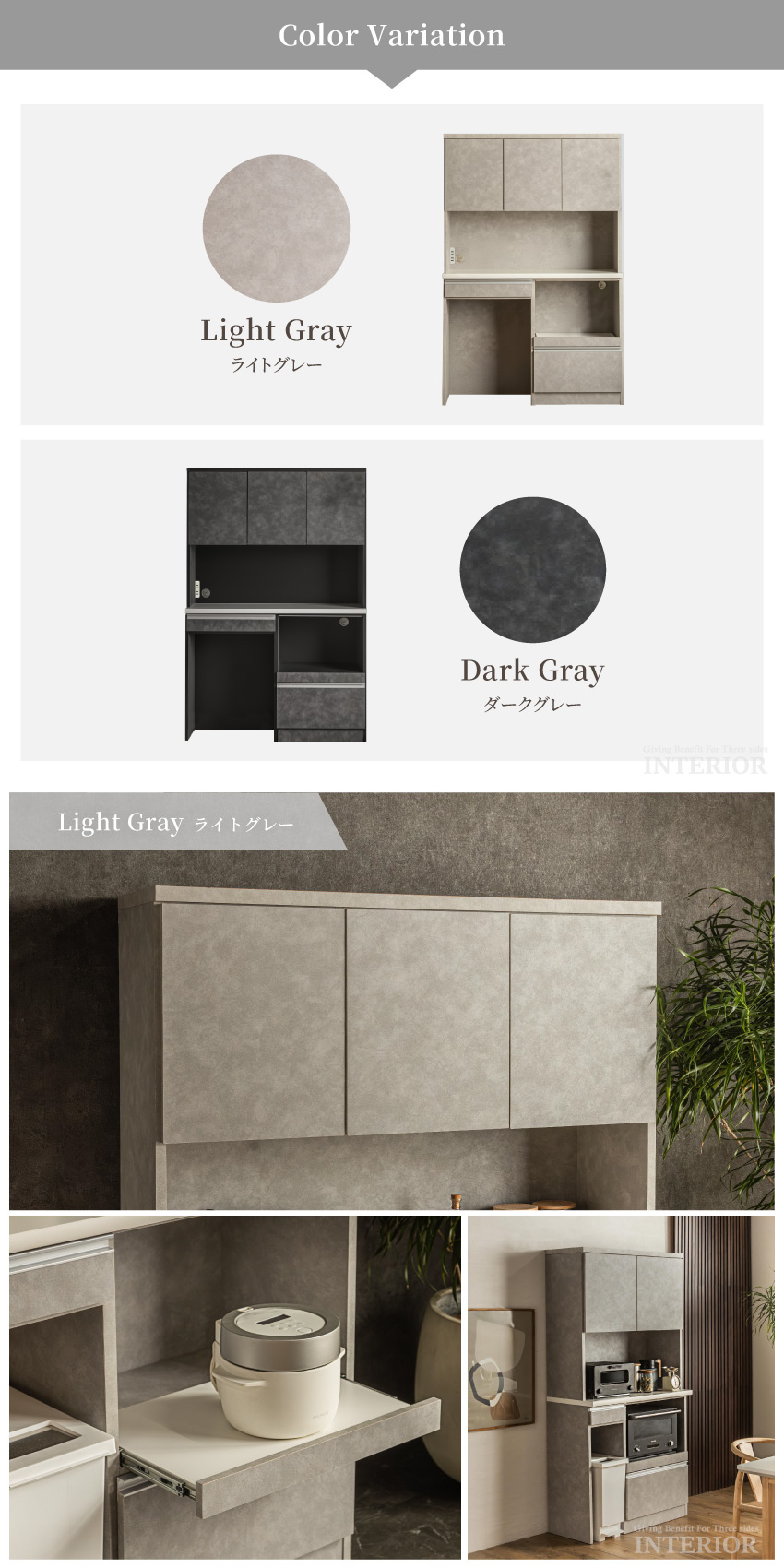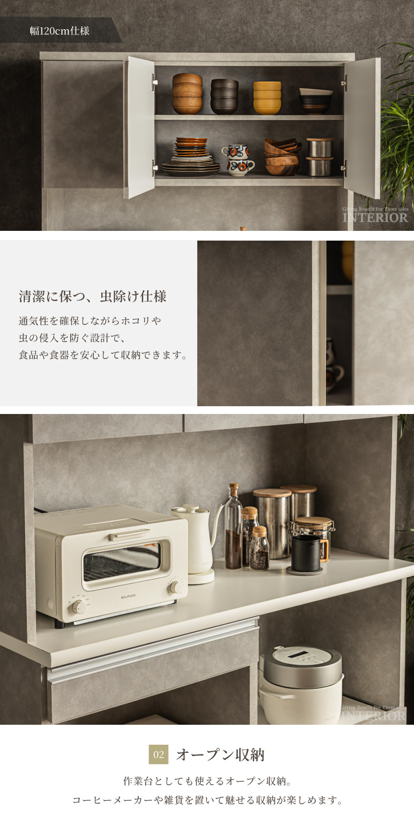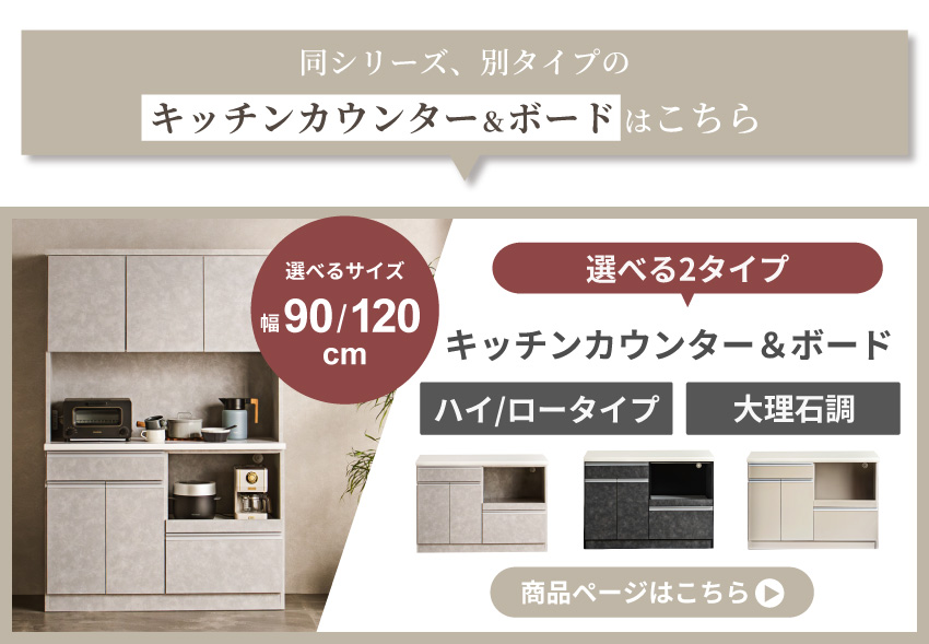 | 上品で落ち着いた印象のキッチンボード。人気のライトグレーと、シックなダークグレーの2カラー展開です。上部扉は虫除け仕様で、食器や食品を清潔に収納。下部には分別しやすいダストボックススペースを備え、生活感を隠してキッチンを美しく保ちます。幅120cmのハイタイプは家族暮らしにも十分な収納力。省スペースで使いたい方には幅90cmタイプもご用意。見た目と機能性を両立した、スタイリッシュなキッチン収納です。 | ||