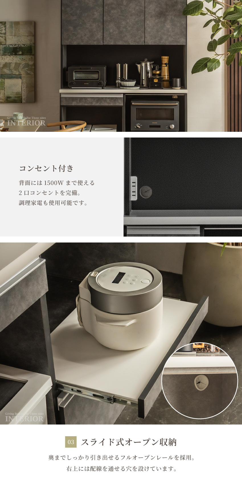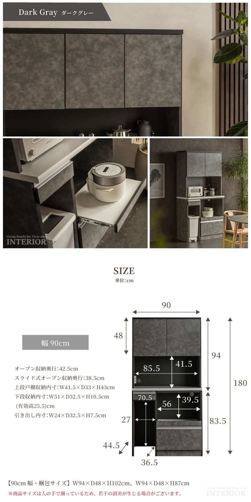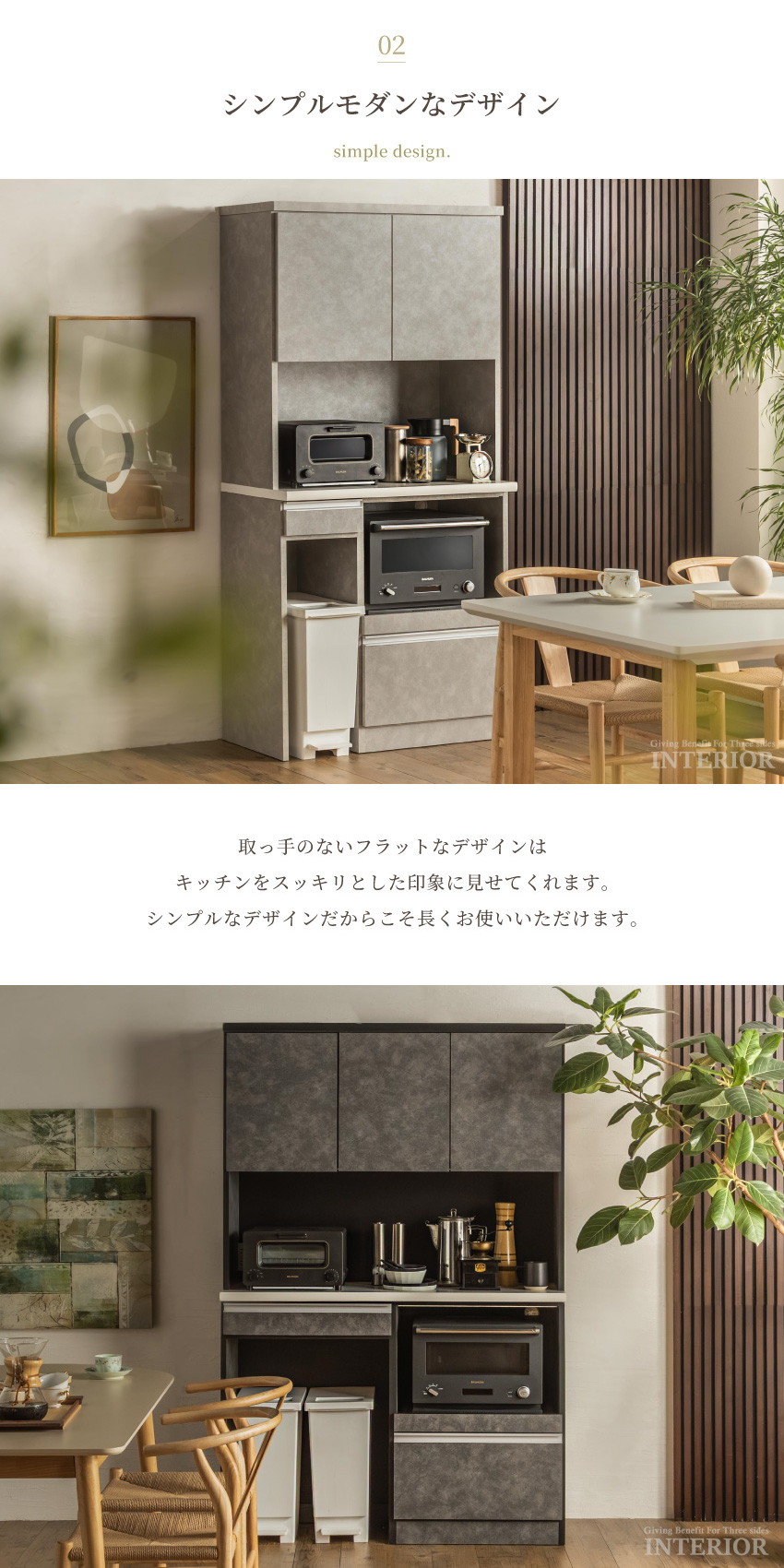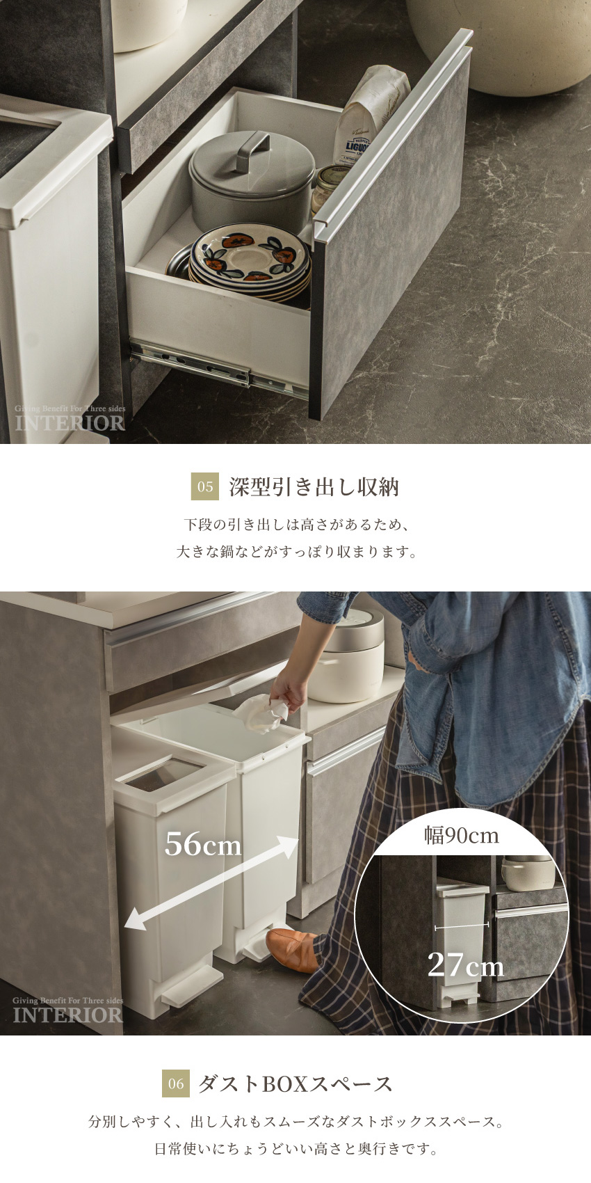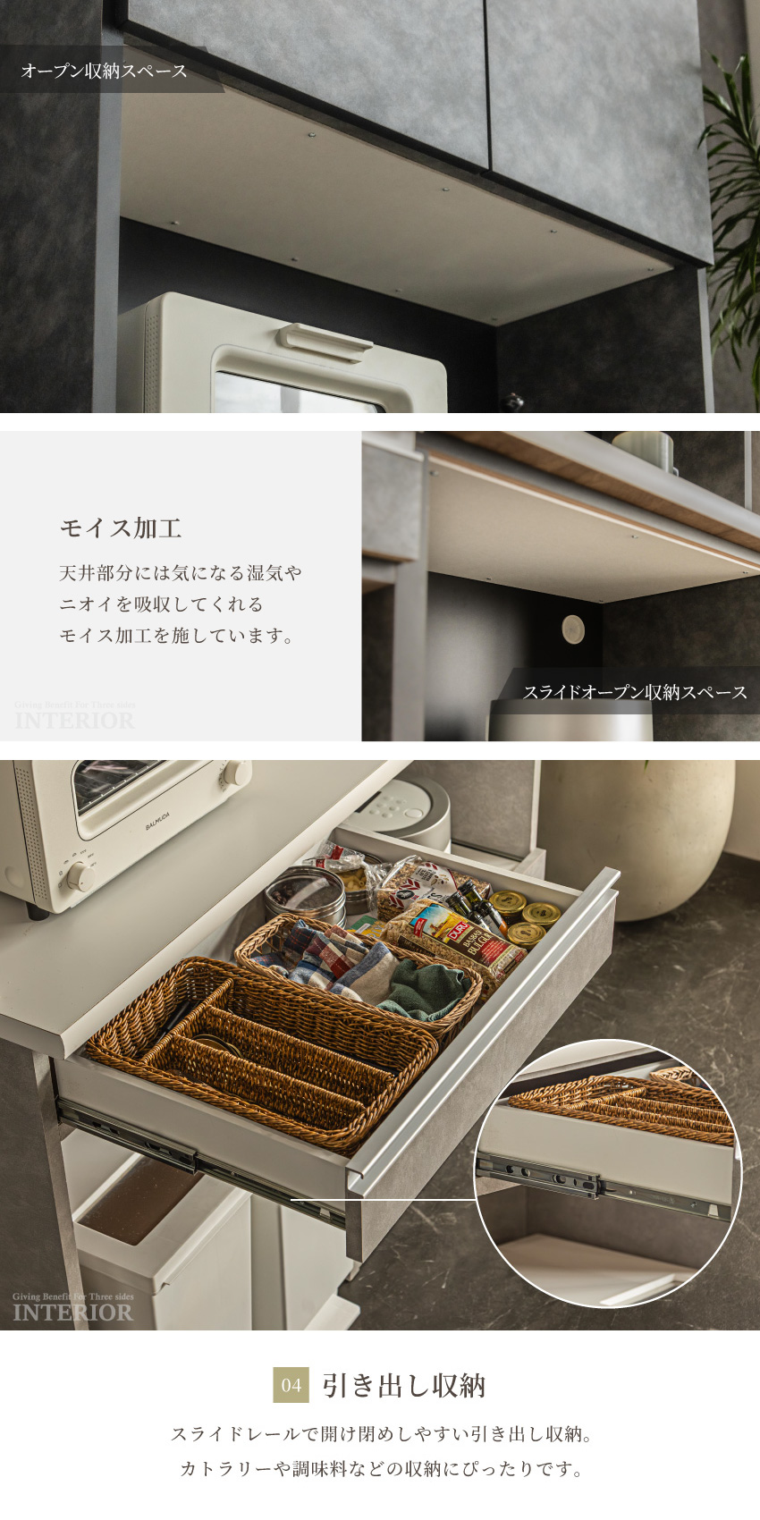 | 上品で落ち着いた印象のキッチンボード。人気のライトグレーと、シックなダークグレーの2カラー展開です。上部扉は虫除け仕様で、食器や食品を清潔に収納。下部には分別しやすいダストボックススペースを備え、生活感を隠してキッチンを美しく保ちます。幅120cmのハイタイプは家族暮らしにも十分な収納力。省スペースで使いたい方には幅90cmタイプもご用意。見た目と機能性を両立した、スタイリッシュなキッチン収納です。 | ||