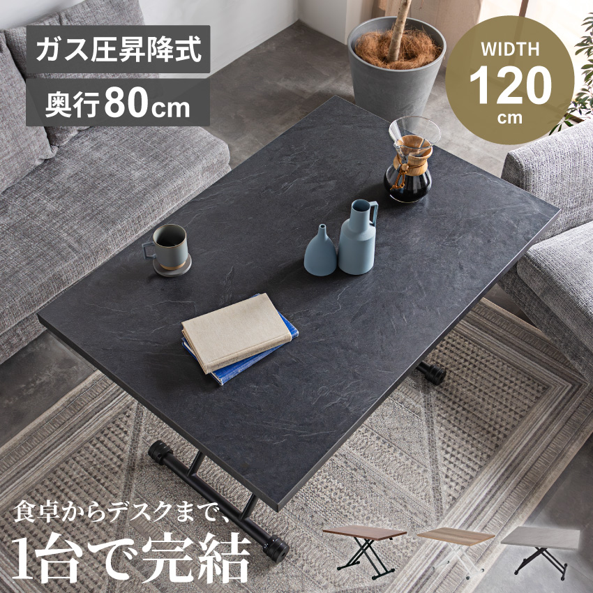 さまざまなライフスタイルに合わせて使えるガス圧式昇降テーブル。簡単なレバー操作で高さ調節出来ます。コンパクト収納と、ラクラク移動が便利な商品です。使い勝手のよい、広々とした天板で、ダイニングテーブルや、ワーキングスペースとしてご使用いただけます。メラニン樹脂化粧板を使用、お手入れも簡単で、耐久性にも優れます。 【ご注意】 大理石調に関して、大理石のような凹凸を感じられる「エンボス加工」を施しているので、加工の特性上、書類に文字が書きづらいことがございます。 | ||