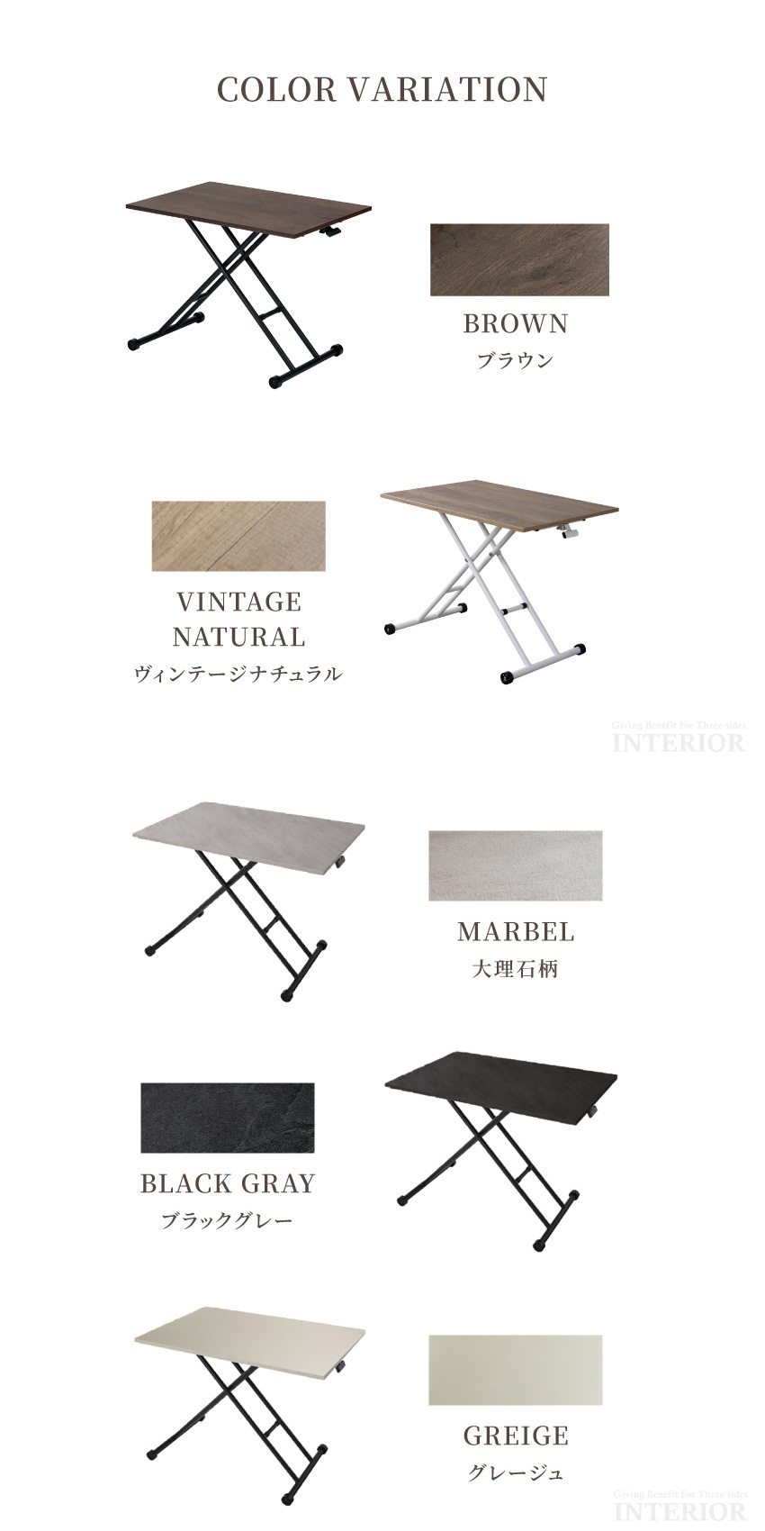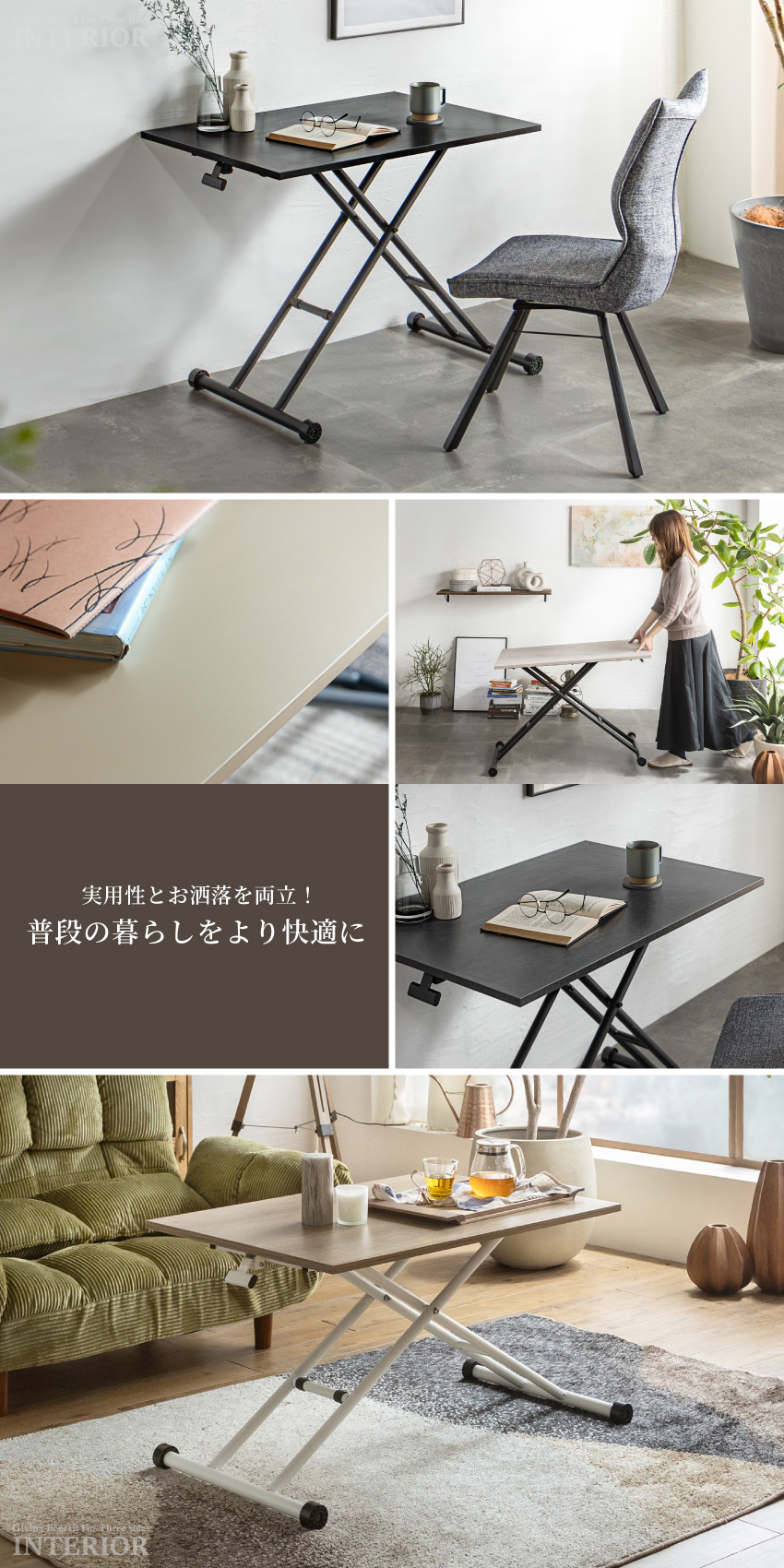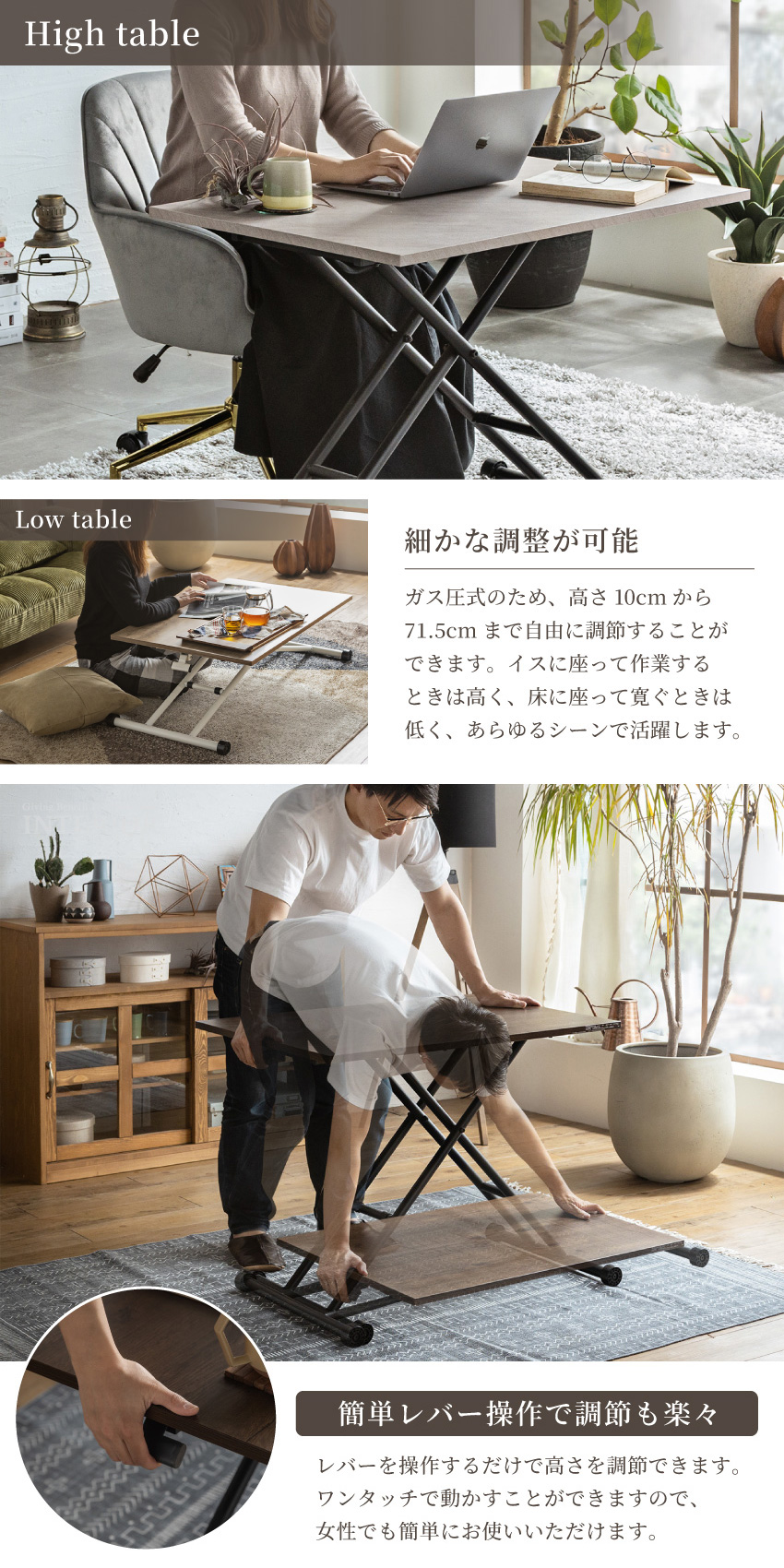 | ライフスタイルやシーンに合わせて高さを調節できるから様々な使い方ができます。移動もラクラクできて使う場所を選びません。マルチに何役もこなす便利なテーブルです。 【ご注意】 大理石調に関して、大理石のような凹凸を感じられる「エンボス加工」を施しているので、加工の特性上、書類に文字が書きづらいことがございます。 | ||