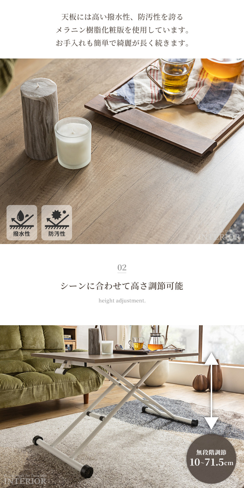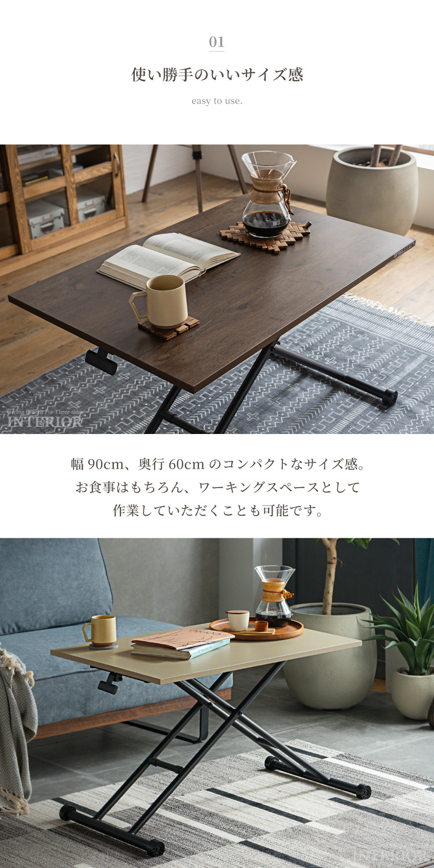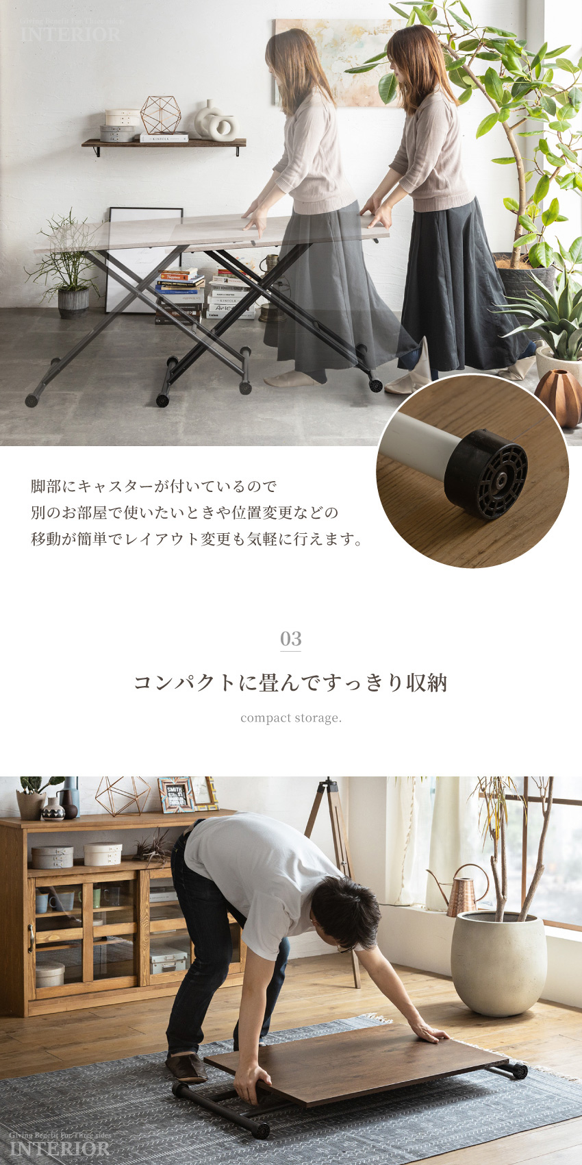 | ライフスタイルやシーンに合わせて高さを調節できるから様々な使い方ができます。移動もラクラクできて使う場所を選びません。マルチに何役もこなす便利なテーブルです。 【ご注意】 大理石調に関して、大理石のような凹凸を感じられる「エンボス加工」を施しているので、加工の特性上、書類に文字が書きづらいことがございます。 | ||