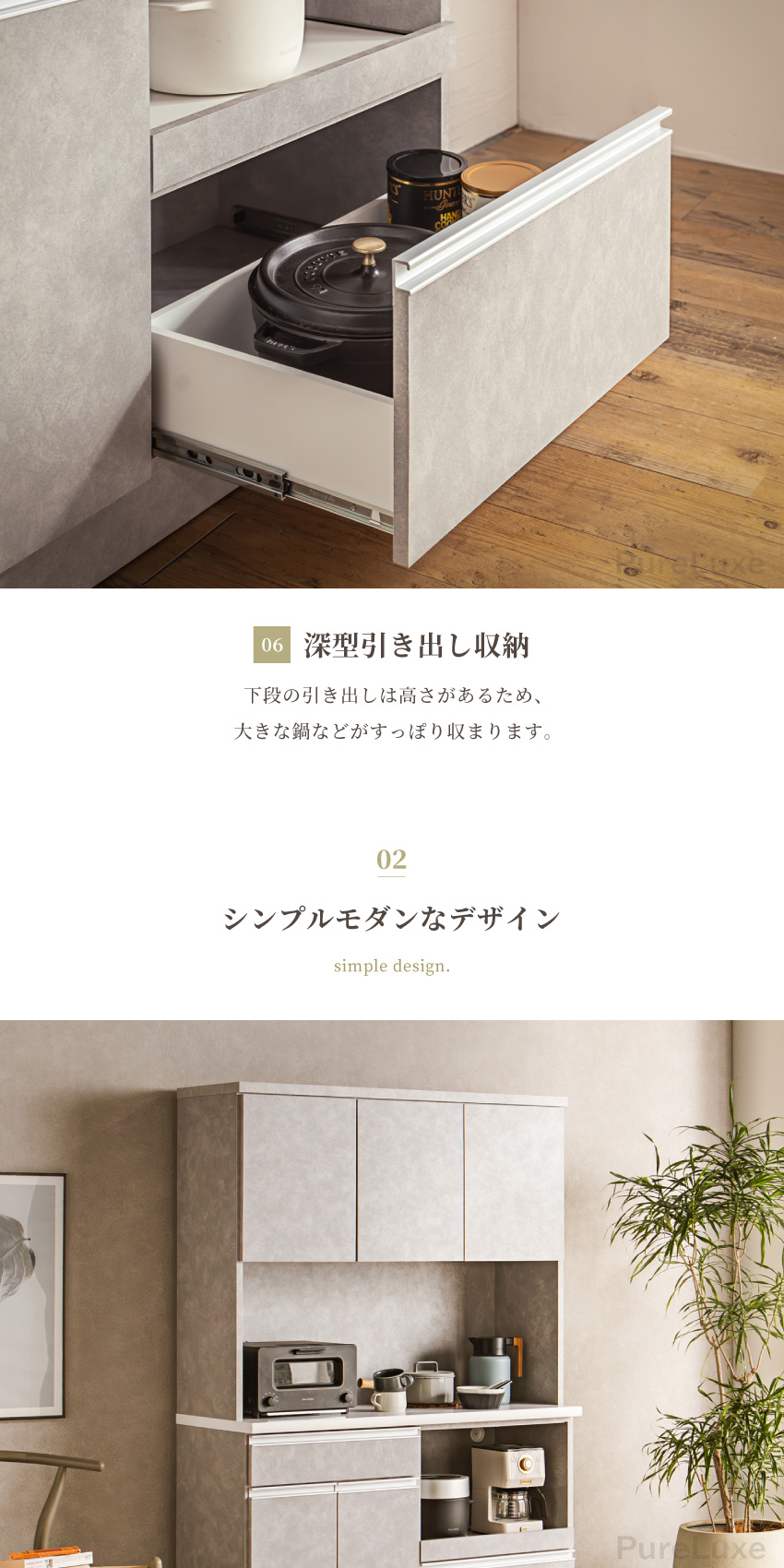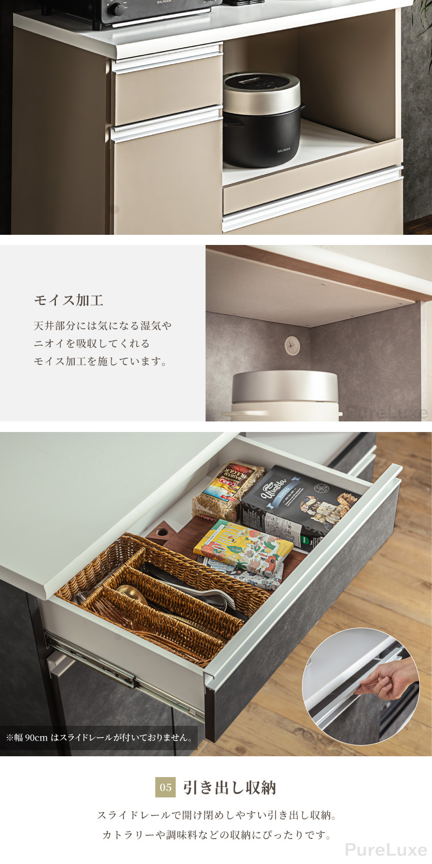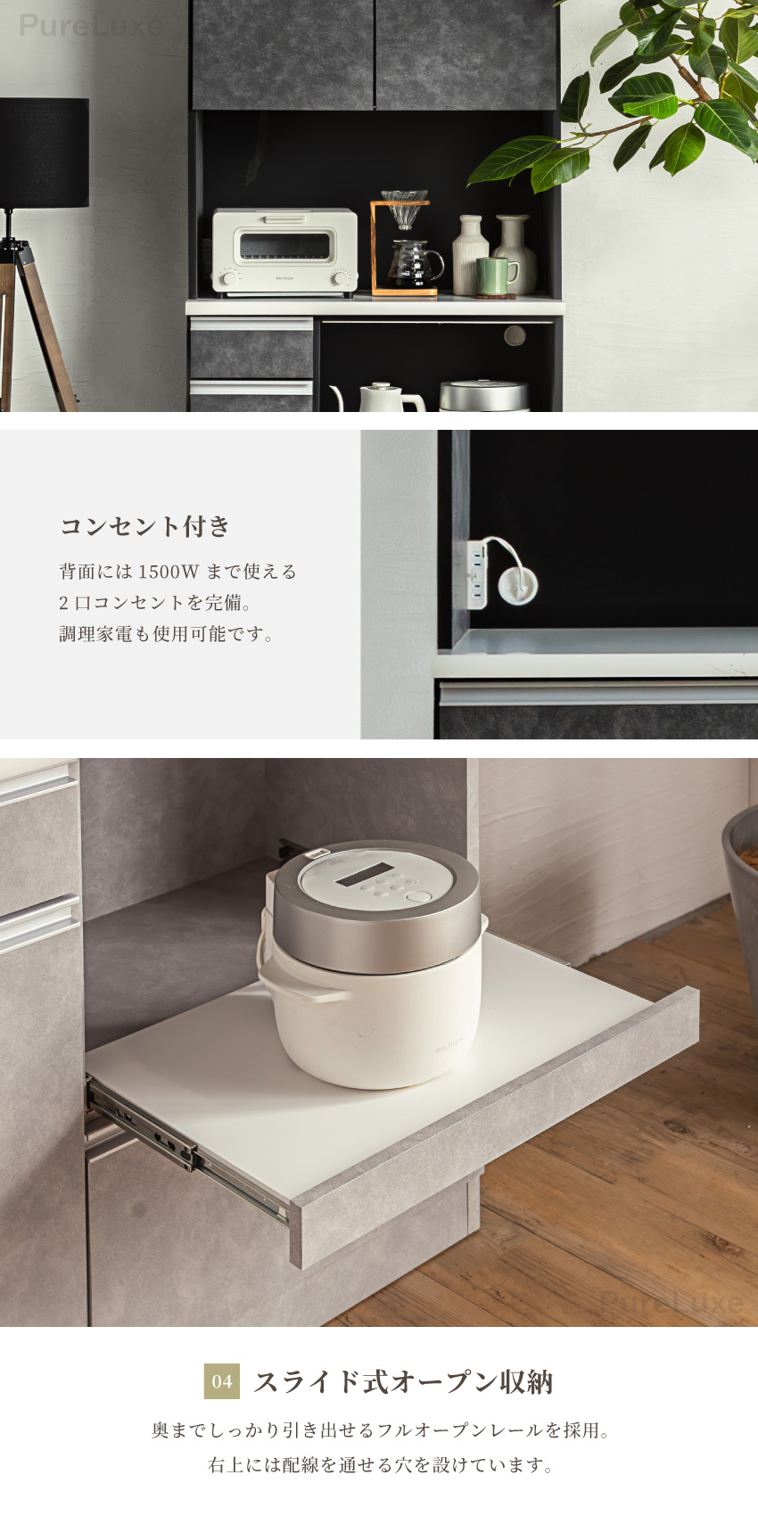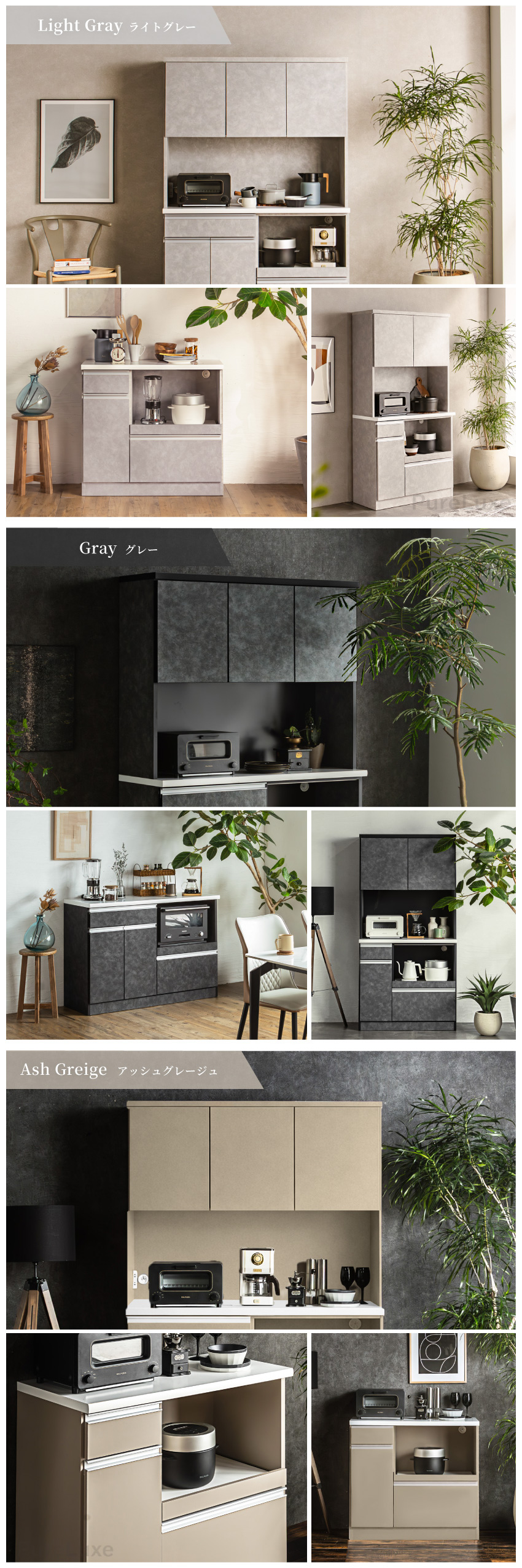 | キッチン周りの物がたっぷり収納できるカップボード。可動棚付きの戸棚があり、収納するものに合わせて自由に高さが調節できます。オープンスペースにはコンセントと消臭効果を備えたモイスを完備しているため、調理家電を置くのにぴったりです。スライドレール仕様の収納もあり、使うときだけ引き出すことができます。豊富なバリエーションをご用意しておりますので、キッチンに合わせてお選びいただけます。 | ||