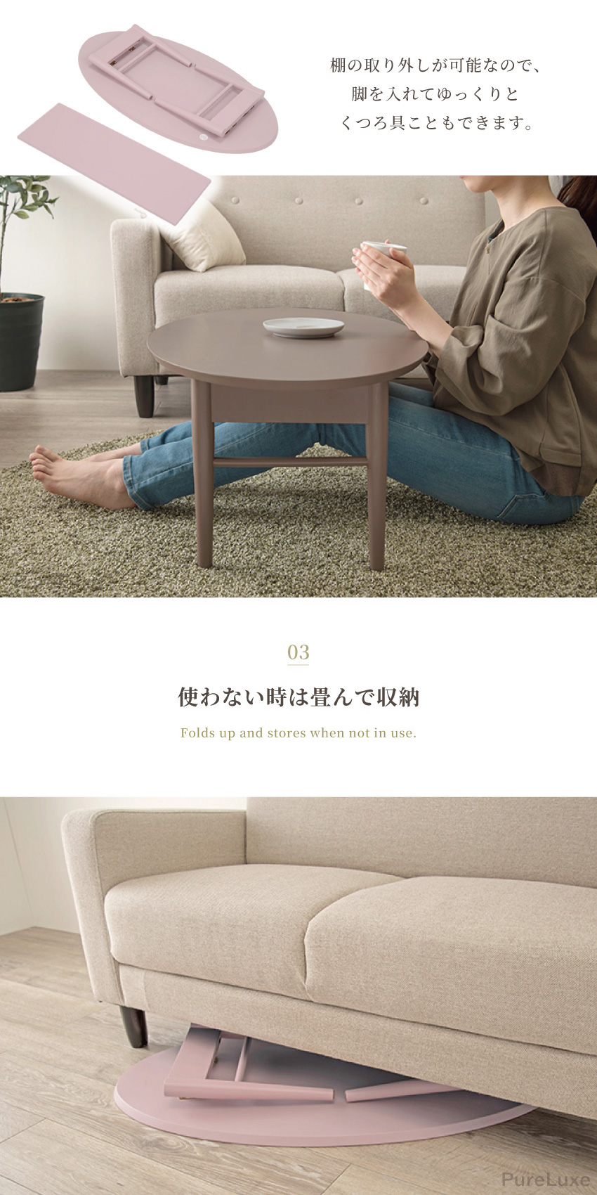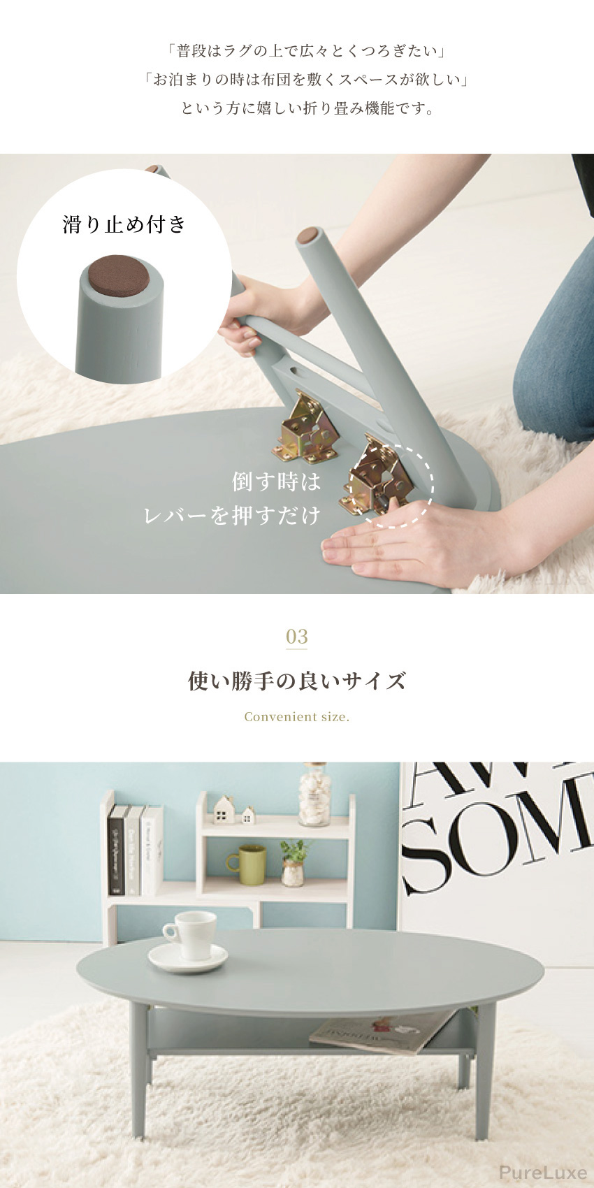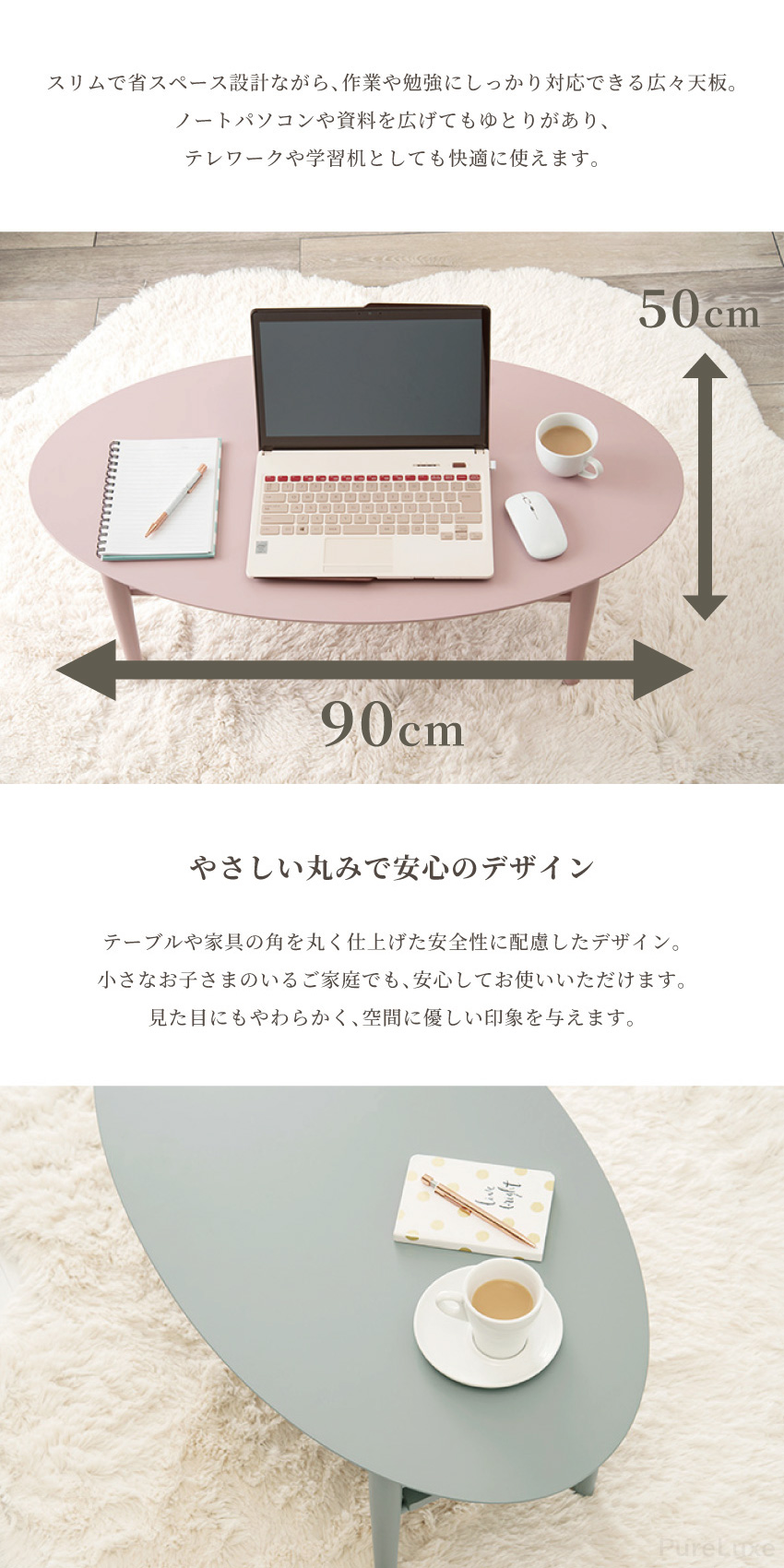 | ワンルームや子ども部屋に置きやすいコンパクトな折れ脚テーブル。物が置けて便利な棚付き、使わない時は脚を折り畳んでサッと収納。見た目も可愛いオーバル型で4種類のカラーの中からお部屋にぴったりなテーブルを見つけてください。 | ||
