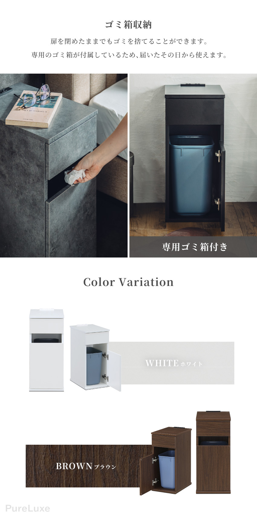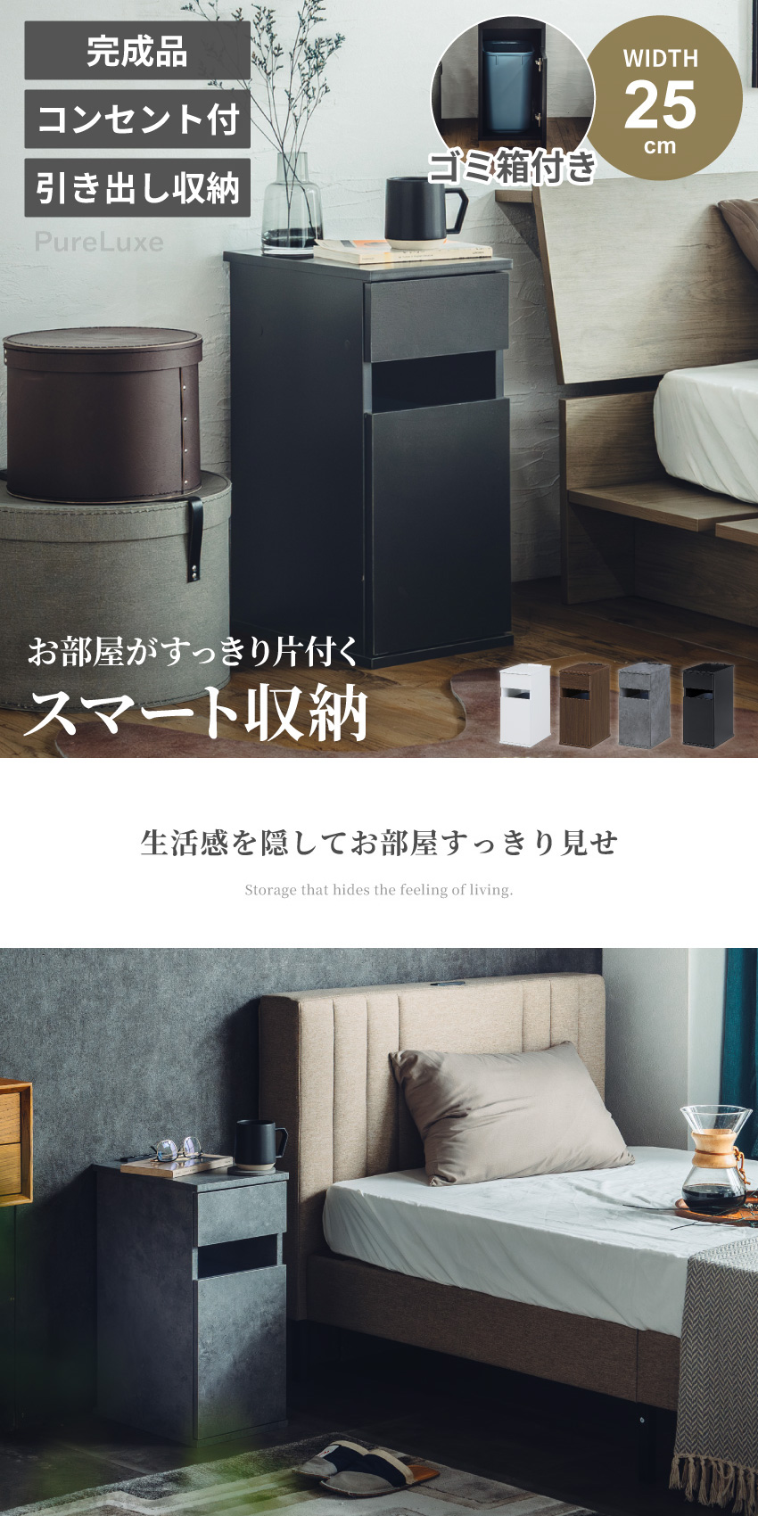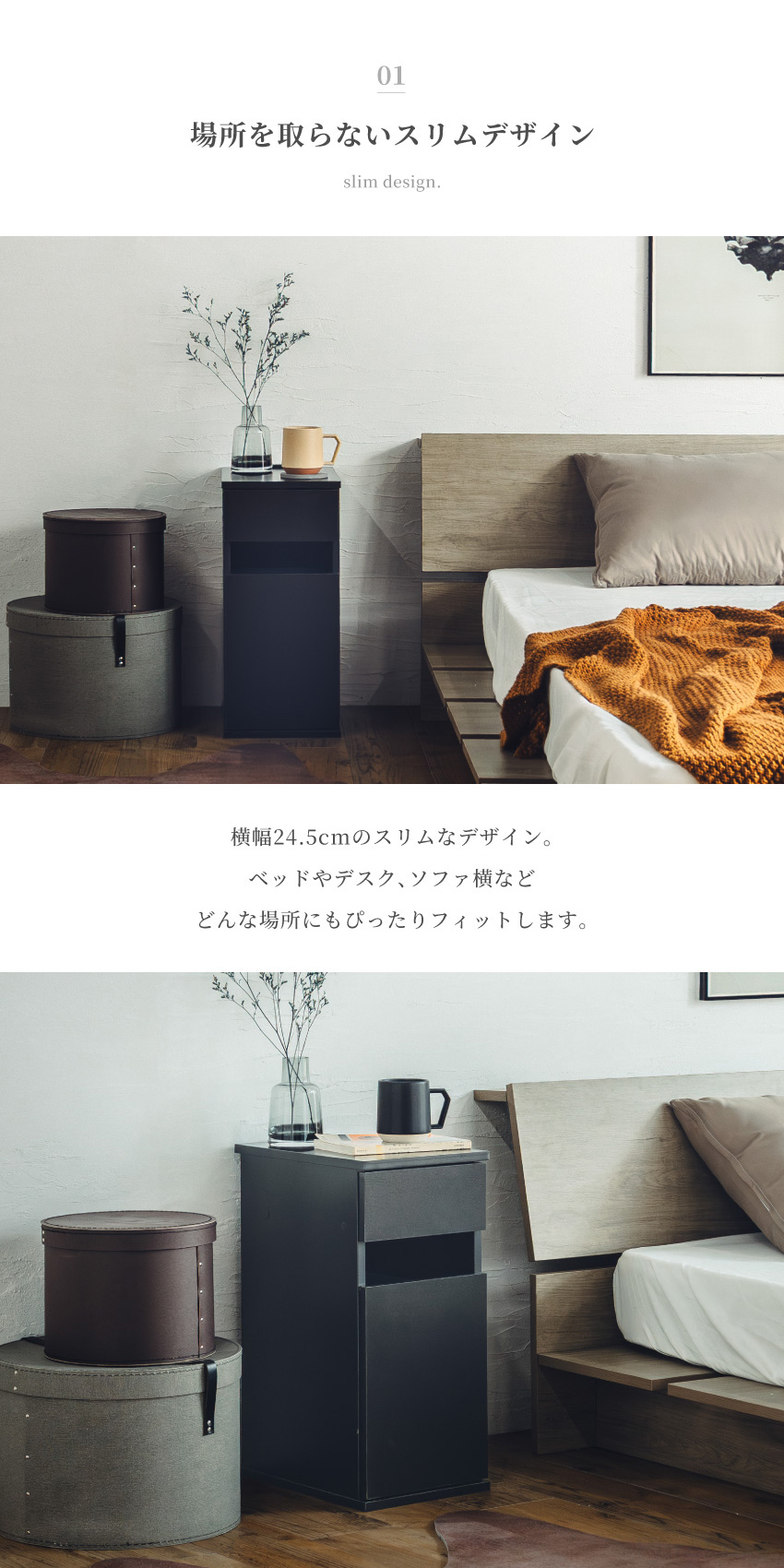 | 専用のゴミ箱付きナイトテーブル。ゴミ箱は扉を閉めたまま使用できるため、生活感のないすっきりとしたお部屋を演出します。幅25cmのスリムサイズでソファやベッド、デスク横にぴったりフィットします。天板には便利な2口コンセント付き。さらに引き出しが1杯ついているため、眼鏡や本など小物をまとめて収納できます。 | ||