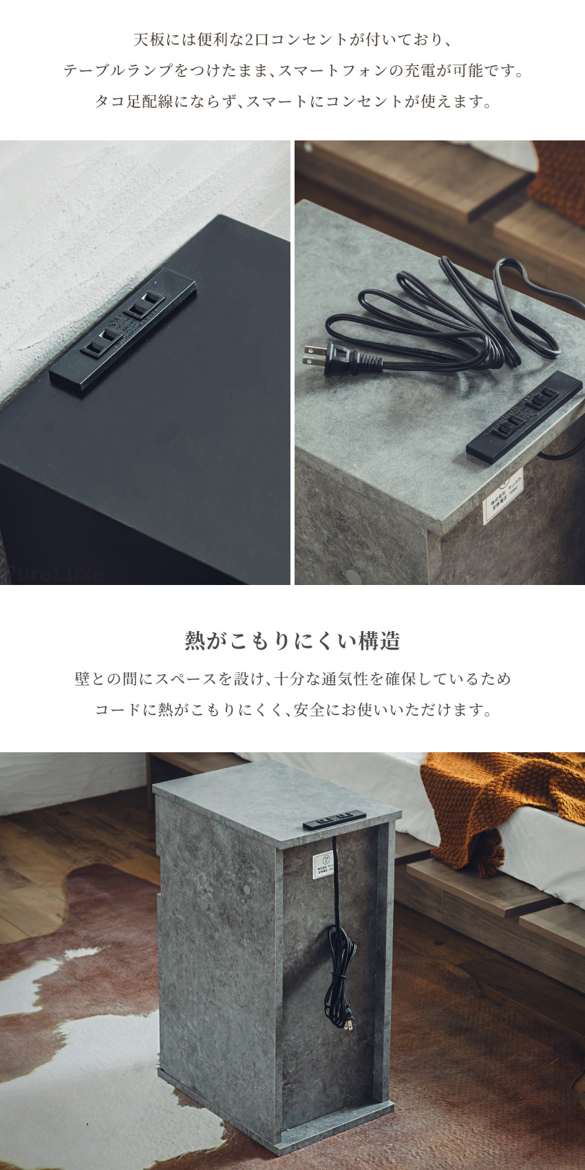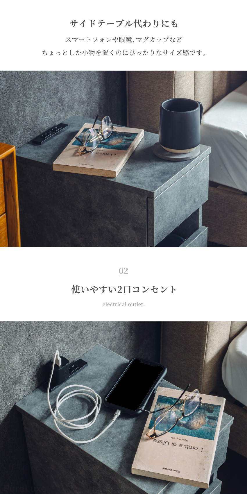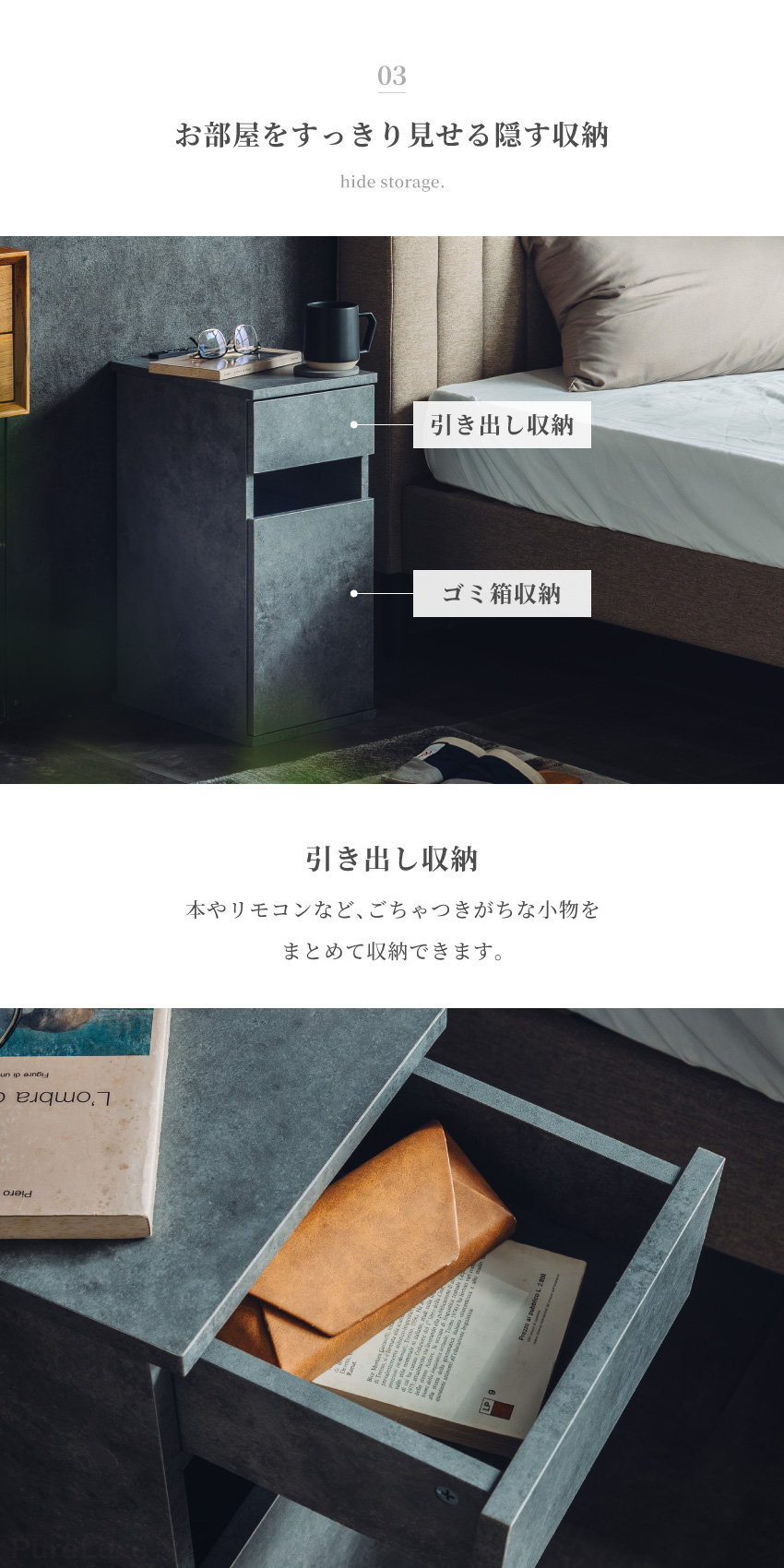 | 専用のゴミ箱付きナイトテーブル。ゴミ箱は扉を閉めたまま使用できるため、生活感のないすっきりとしたお部屋を演出します。幅25cmのスリムサイズでソファやベッド、デスク横にぴったりフィットします。天板には便利な2口コンセント付き。さらに引き出しが1杯ついているため、眼鏡や本など小物をまとめて収納できます。 | ||