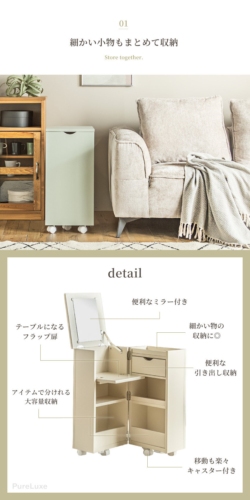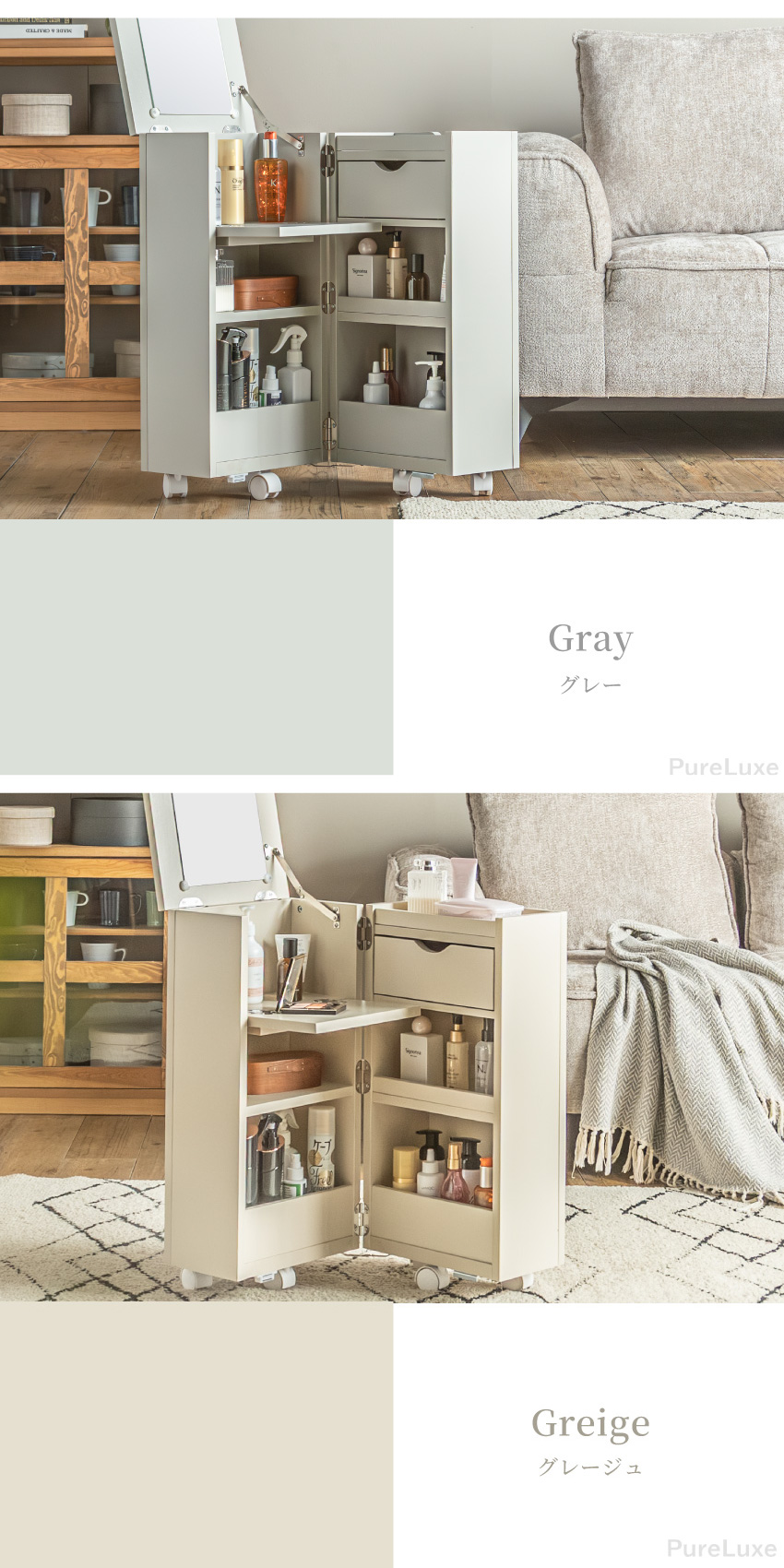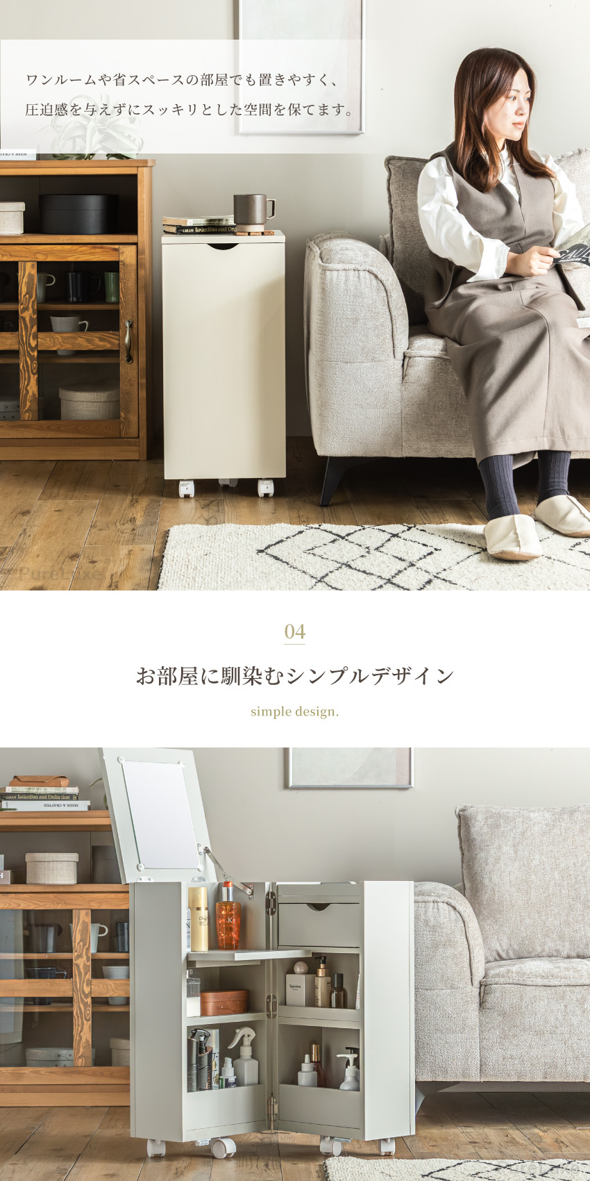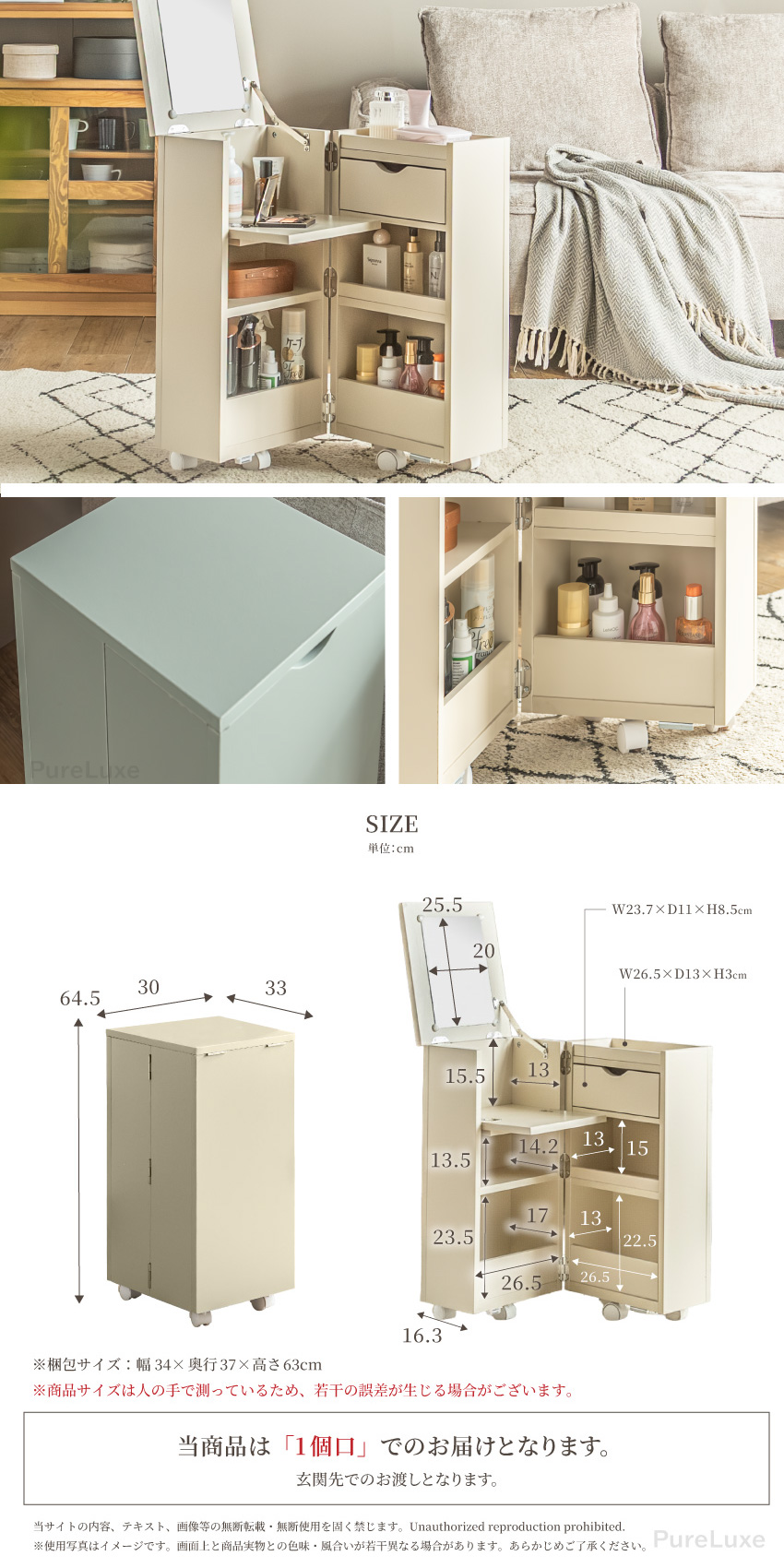 | コンパクトで大容量なメイクボックス。幅30cmで省スペースで収納可能。ミラー付きでフラップ扉はテーブルに。たたむとサイドボード代わりに使用できキャスター付きで移動もラクラク。一人暮らしのお部屋にもぴったりのメイクボックスワゴンです。 | ||