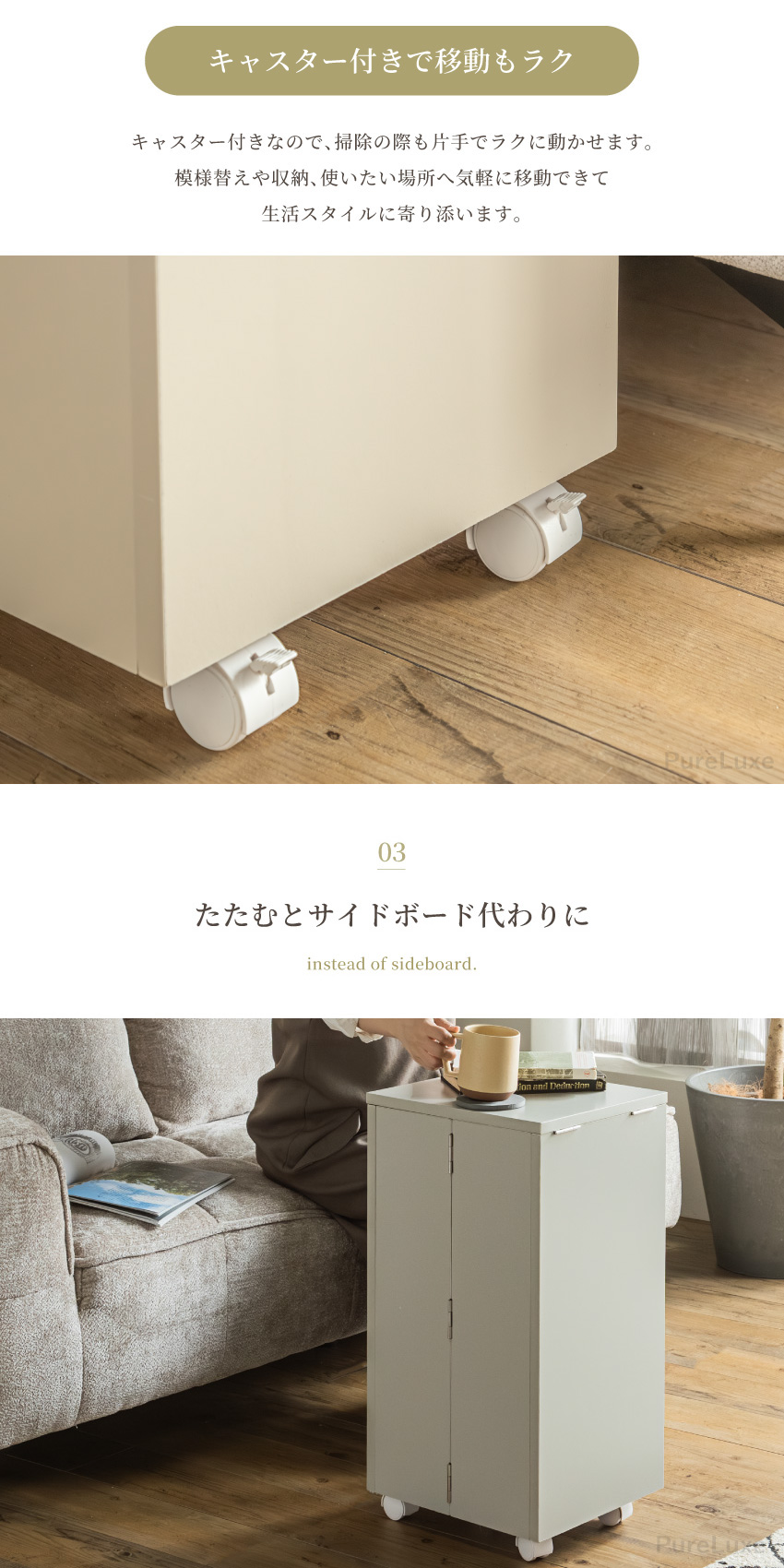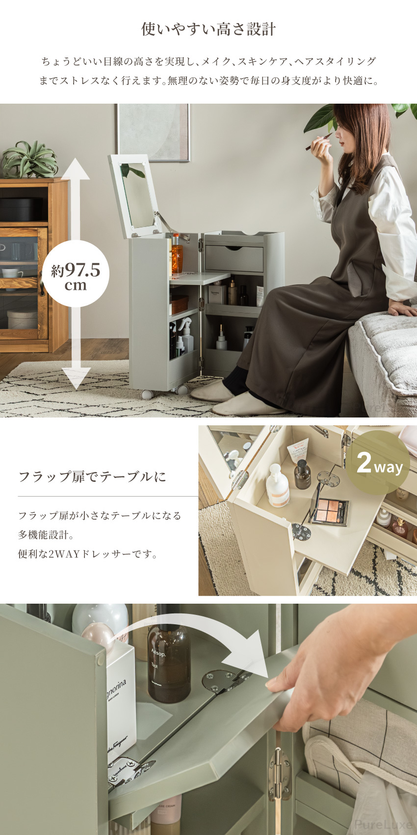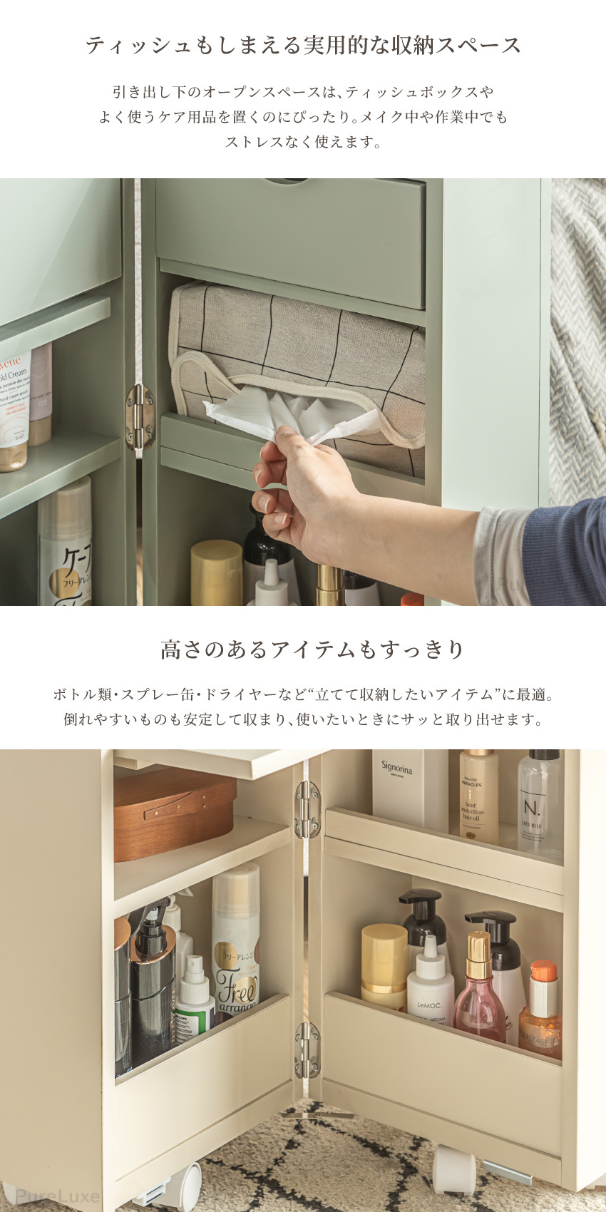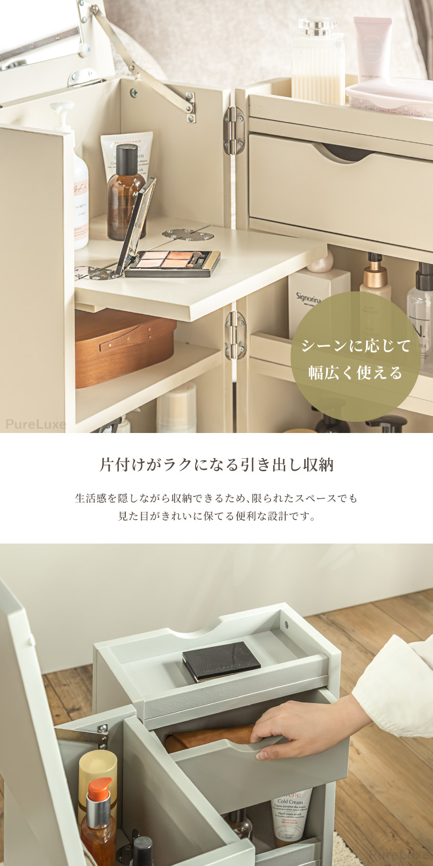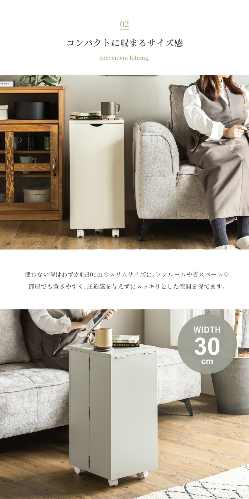| コンパクトで大容量なメイクボックス。幅30cmで省スペースで収納可能。ミラー付きでフラップ扉はテーブルに。たたむとサイドボード代わりに使用できキャスター付きで移動もラクラク。一人暮らしのお部屋にもぴったりのメイクボックスワゴンです。 | ||