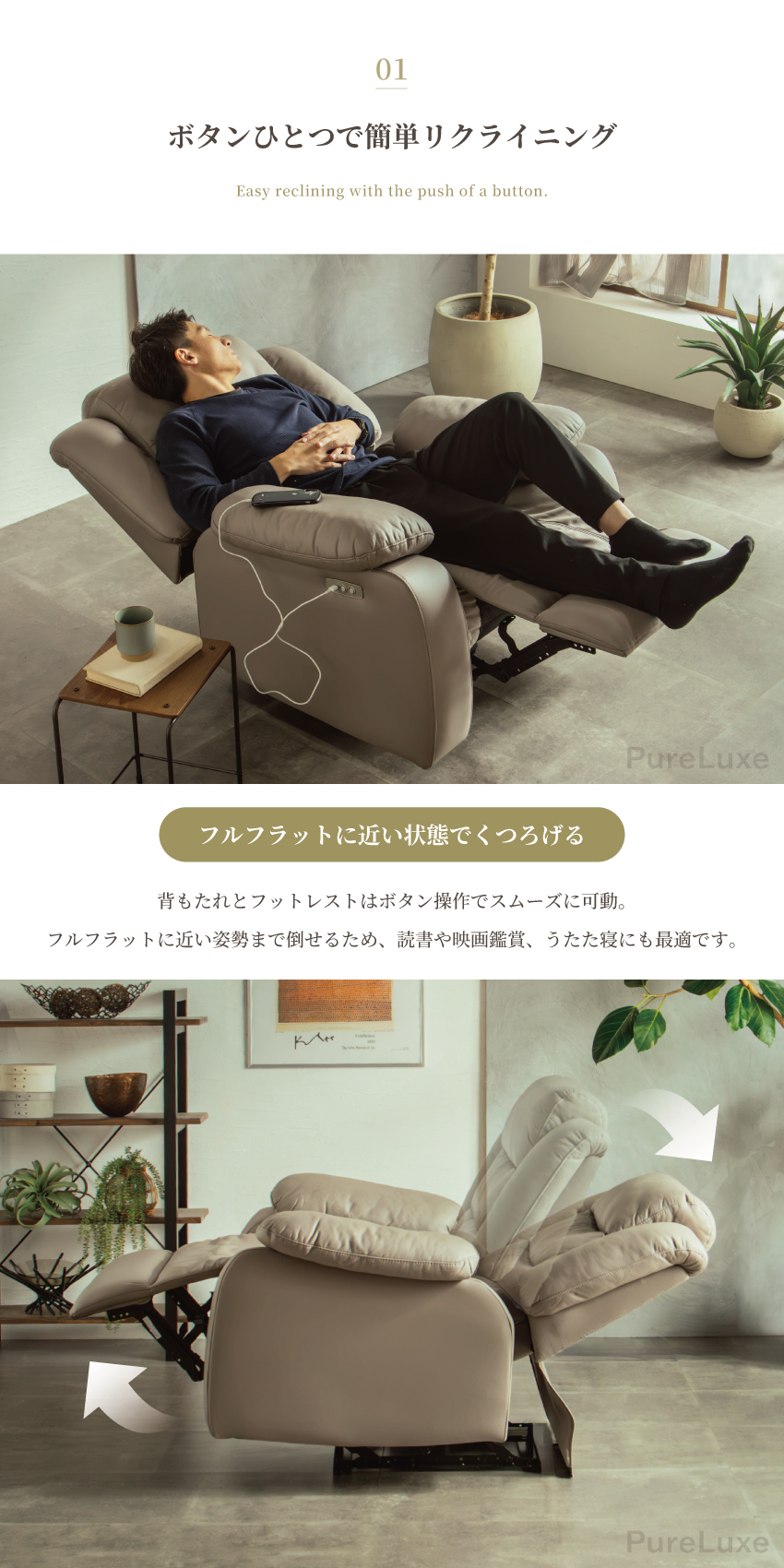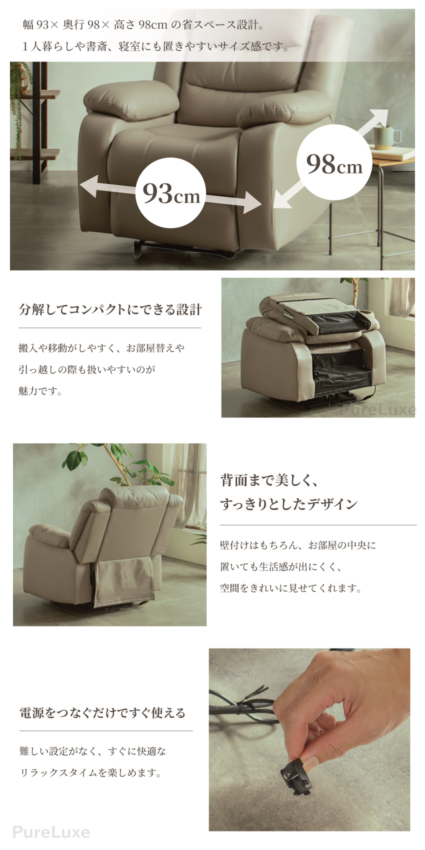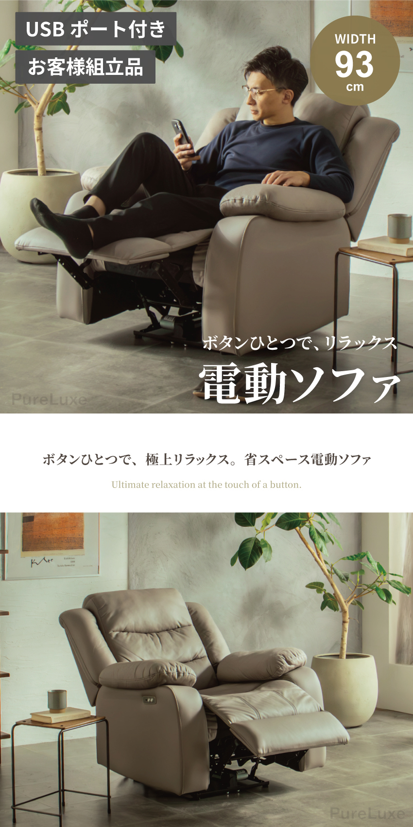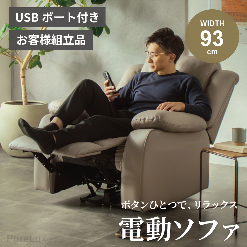 | ボタン操作で背もたれとフットレストが可動する、1人掛け用の電動リクライニングソファ。フルフラットに近い姿勢まで倒せるため、読書や映画鑑賞、うたた寝にも最適。頭までしっかり支えるハイバック仕様で、程よい弾力のある座り心地も魅力です。USBポート付きで利便性も高く、幅93cmの省スペース設計。電源コードをつなぐだけで簡単に使用でき、背面まで美しいデザインに仕上げています。 | ||
