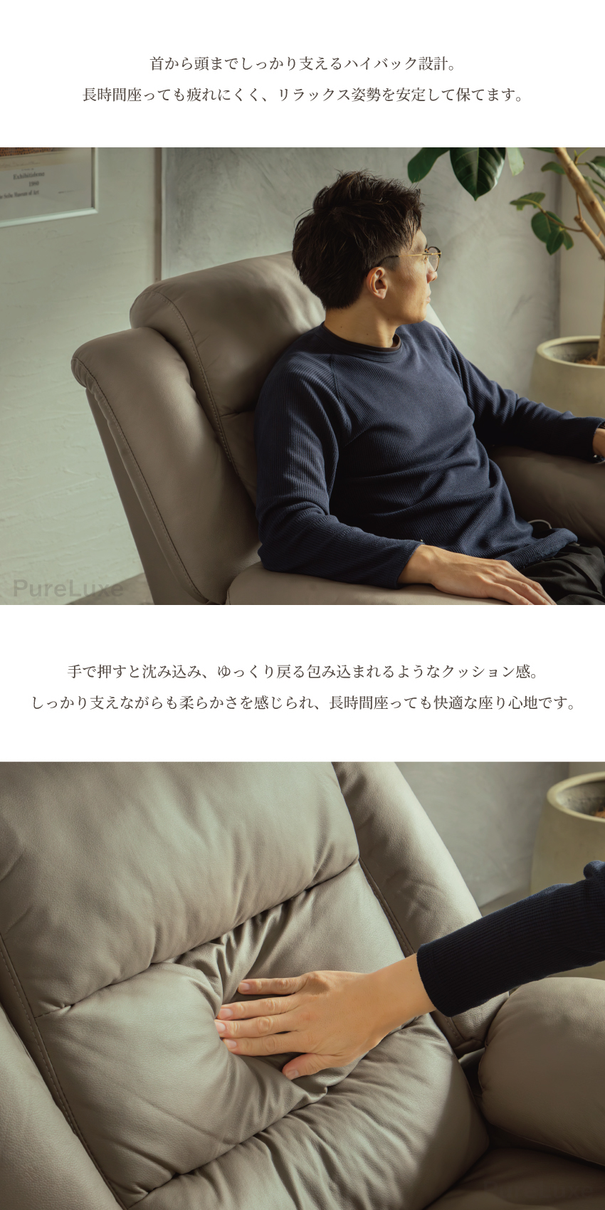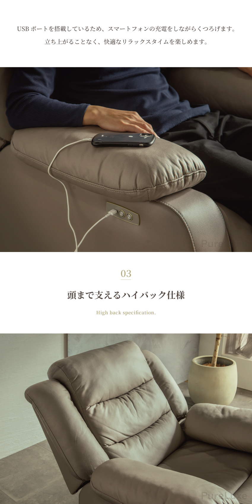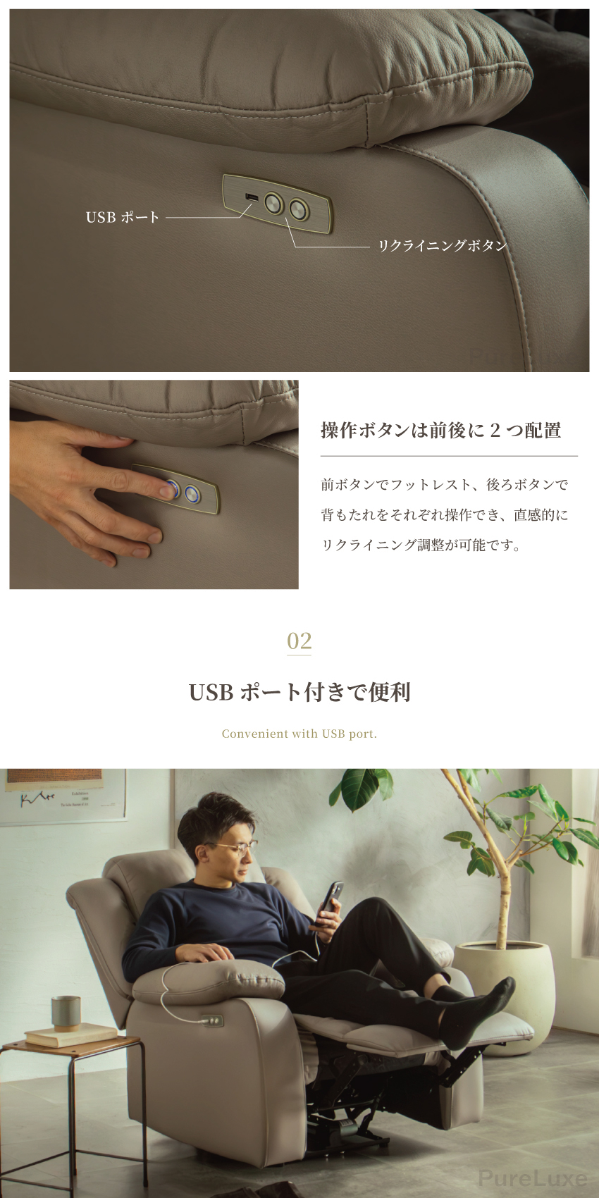 | ボタン操作で背もたれとフットレストが可動する、1人掛け用の電動リクライニングソファ。フルフラットに近い姿勢まで倒せるため、読書や映画鑑賞、うたた寝にも最適。頭までしっかり支えるハイバック仕様で、程よい弾力のある座り心地も魅力です。USBポート付きで利便性も高く、幅93cmの省スペース設計。電源コードをつなぐだけで簡単に使用でき、背面まで美しいデザインに仕上げています。 | ||