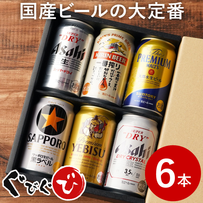 | 仕様 / サイズ | ■内容:6本 ・アサヒ スーパードライ ・アサヒ ドライクリスタル ・キリン 一番搾り ・サントリー ザ・プレミアムモルツ ・ヱビス エビスビール ・サッポロ 生 黒ラベル ■容量:350ml ■生産地:日本 |