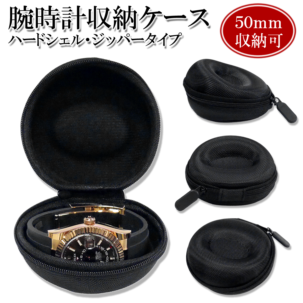 腕時計ケース 1本用 黒 ブラック 時計ケース 携帯 ケース 持ち運び ボックス ウォッチケース トラベルケース ハードタイプ 丸型 50mm対応