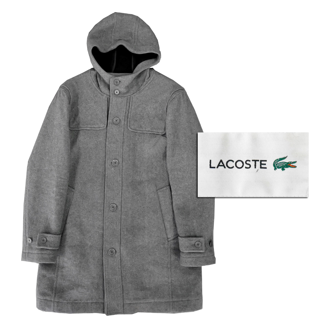 【美品】LACOSTE ラコステ メンズ アウター ジャケット コート グレー フード付き ダッフルコート ボタンコート メルトンウール Mサイズ