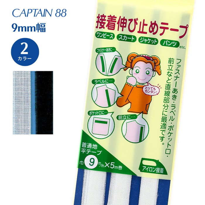 伸び止め平テープ9 CP80 キャプテン CAPTAIN ファスナーあき ラペル ポケット口 前立 オフホワイト 黒 9mm幅