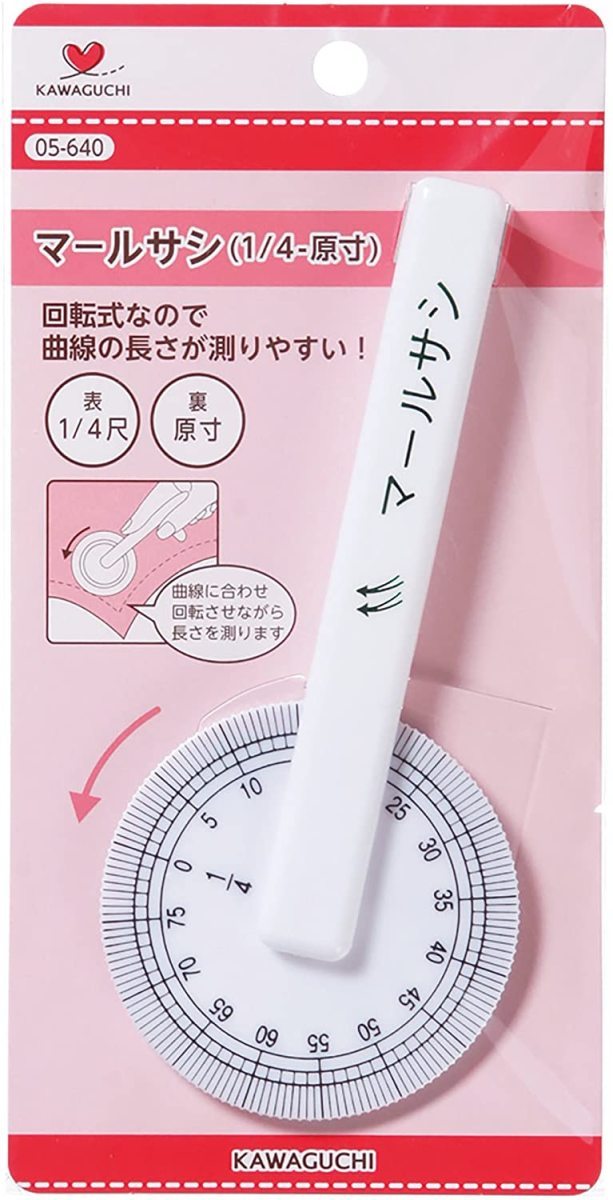 型紙の襟ぐりや袖の曲線部分にコロコロ転がして、長さを計ることができる。