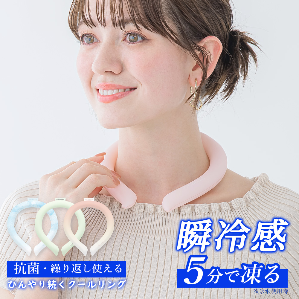 ・暑い真夏の季節でもリングはひんやりキープ!28度以下の空間で凍る不思議な氷「PCM素材」で作られた首元用のネッククーラー。