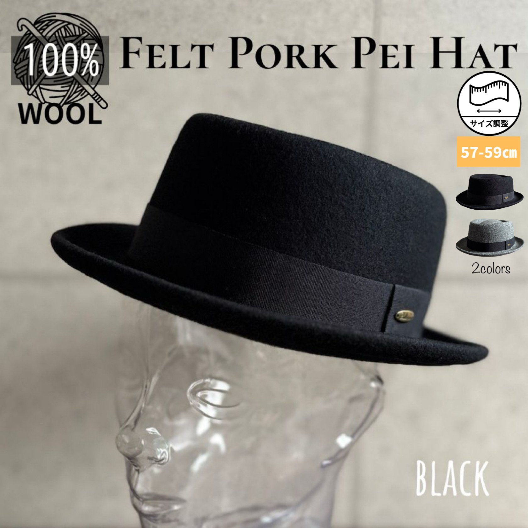 【最短当日発送】 2色展開 帽子 ウール ポークパイ ハット フェルト テラピンチ ウール100% サイズ調整 プレート付 男女兼用 サイズ調整 【複数ご購入送料無料】
