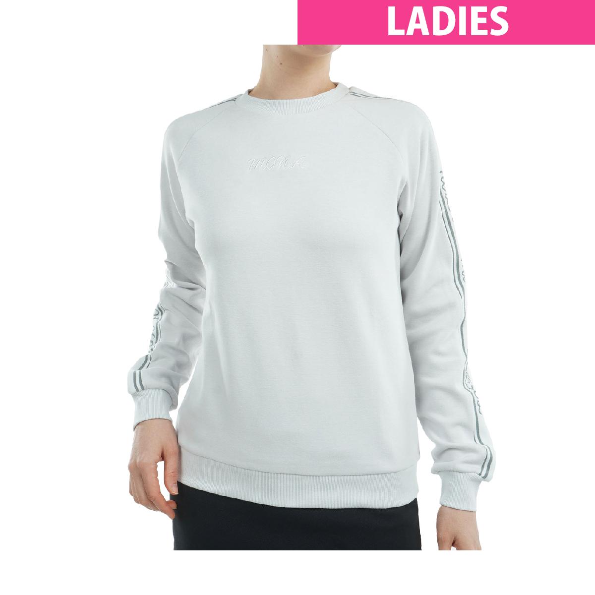 シンプルでありながら、袖から肩にかけてサイドロゴとラインをジャカードで表現した裏毛トレーナー。