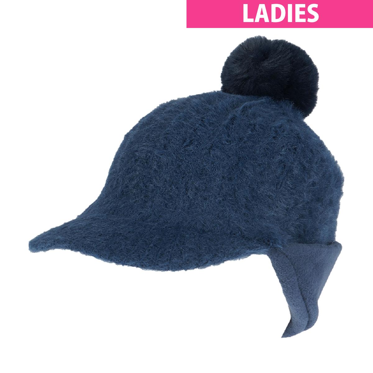 カジュアル感のあるツバや、折り返しのフリース耳当て付きでフェイクファーのポンポンが女性らしさを演出。