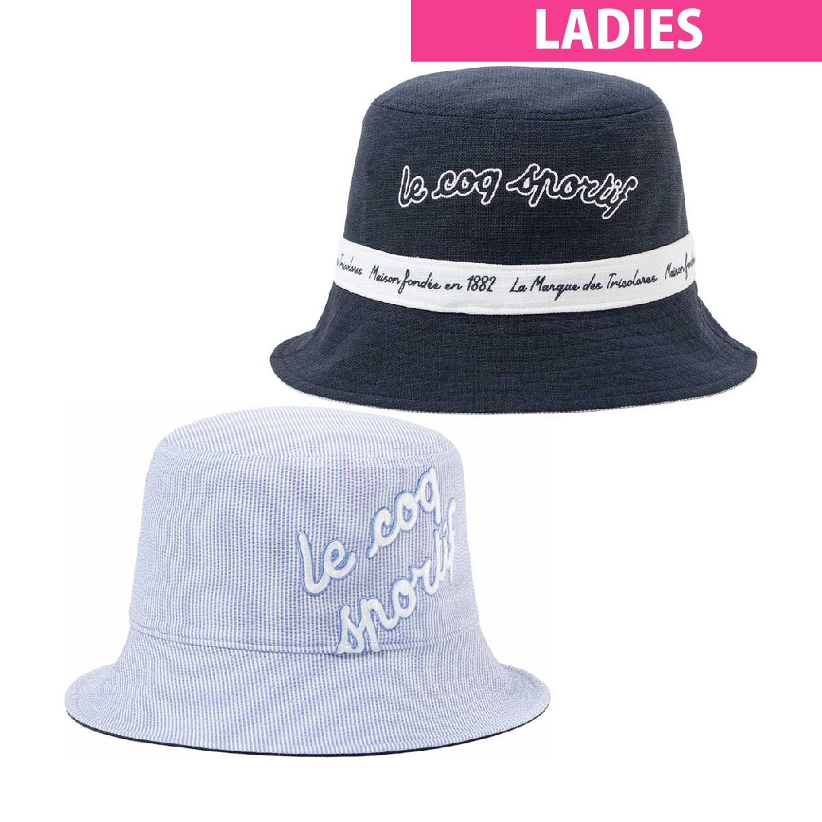 表面は涼しげなサッカー素材、裏面は中央にルコックスポルティフのロゴをテープ調であしらった、女性らしさあふれるリバーシブルハット。