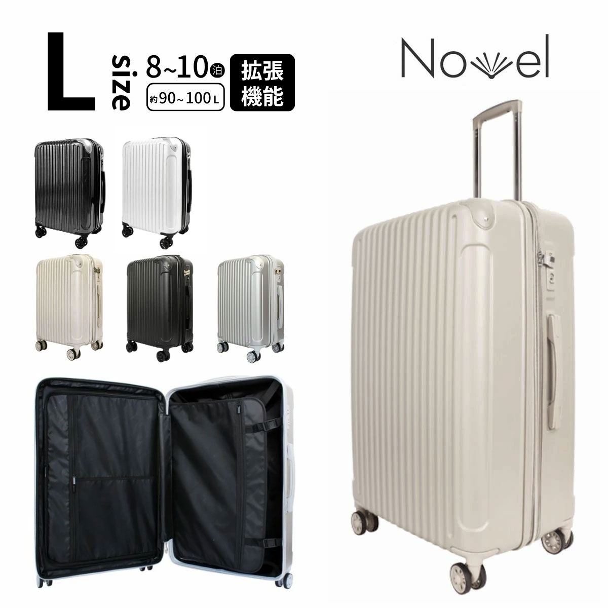 【SALE 50%OFF】 Novel ノーベル 99918 鏡面&エンボスファスナーキャリー Lサイズ 90-100L 拡張機能 8輪キャスター カーボン柄 TSAロック 軽量
