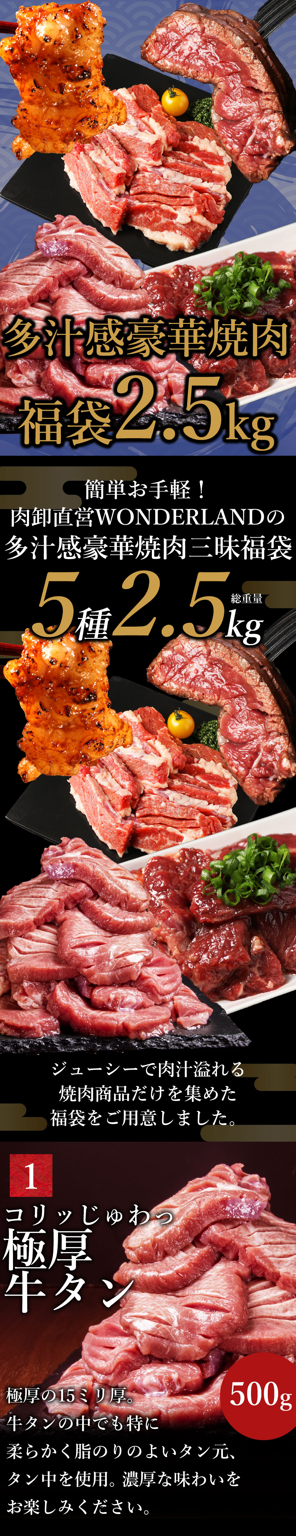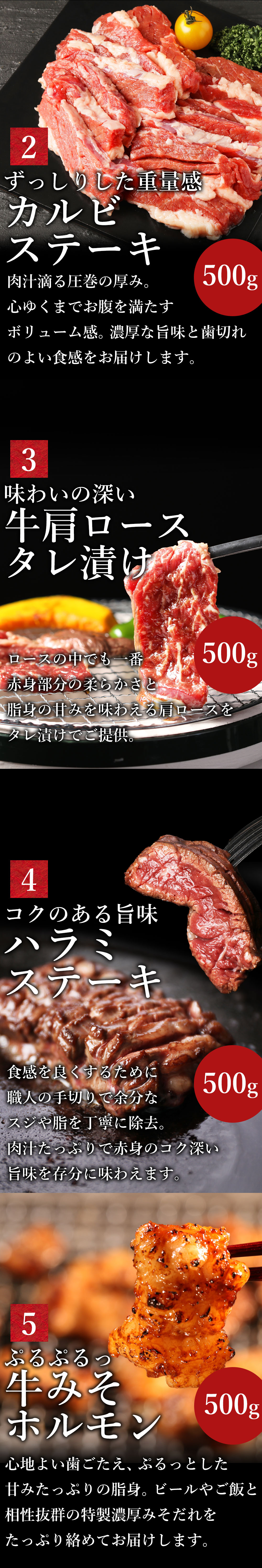 | 規格・内容 | ■多汁感ハラミステーキ(軟化加工)500g×1パック 多汁感カルビステーキ(軟化加工)500g×1パック 牛肩ロースタレ漬け500g×1パック 15mm極厚牛タン(軟化加工)500g×1パック 牛みそホルモン500g×1パック |