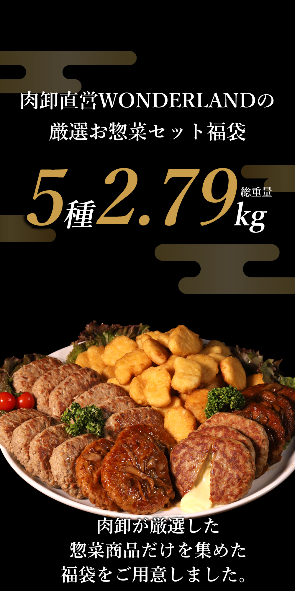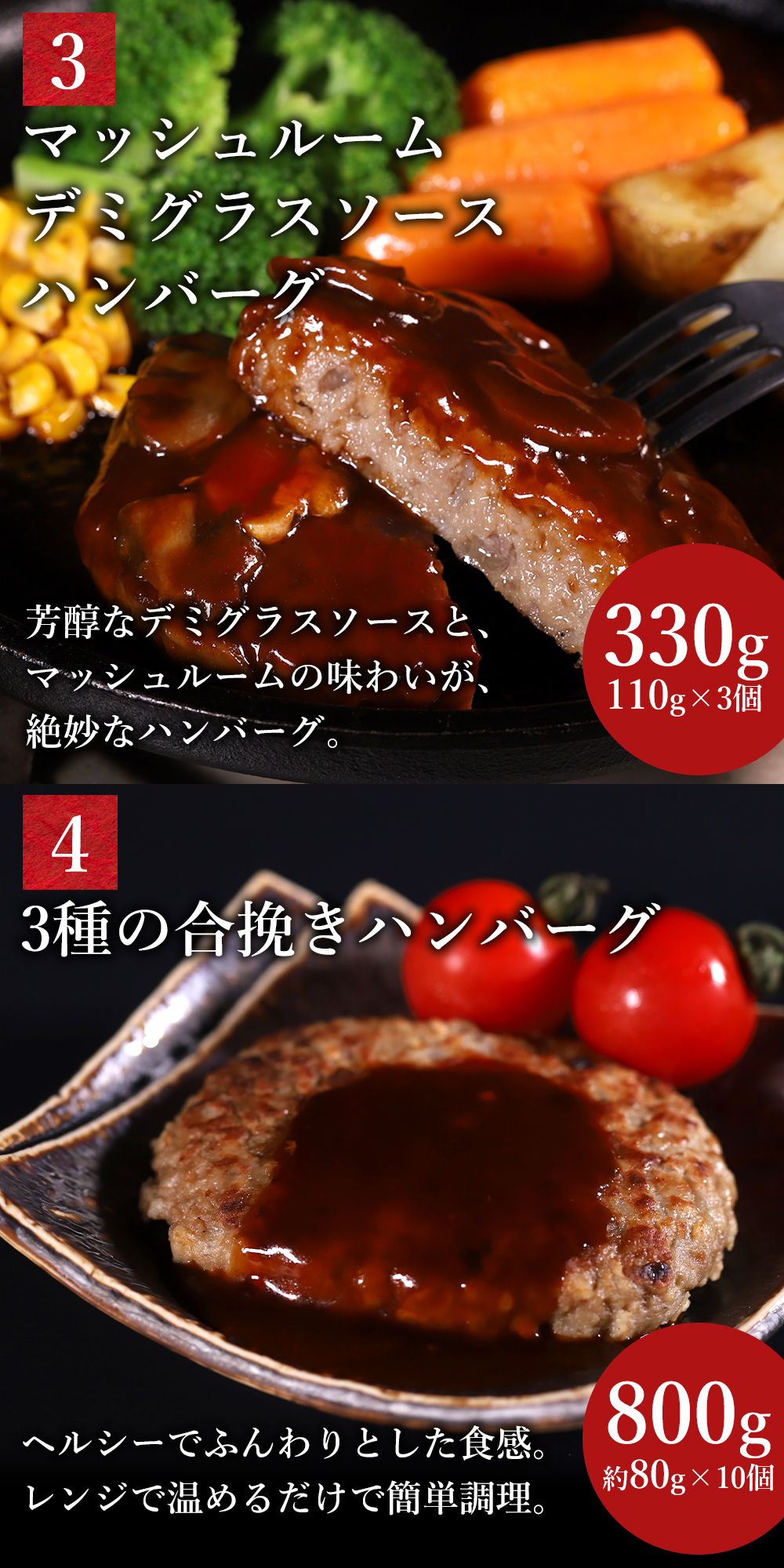 | 規格・内容 | ■まいたけ照り焼きソースハンバーグ 110g×3個 ■マッシュデミソースハンバーグ 110g×3個 ■鉄板焼きチーズインハンバーグ 100g×3個 ■3種の合挽きハンバーグ800g×1パック ■チキンナゲット1kg×1パック |
