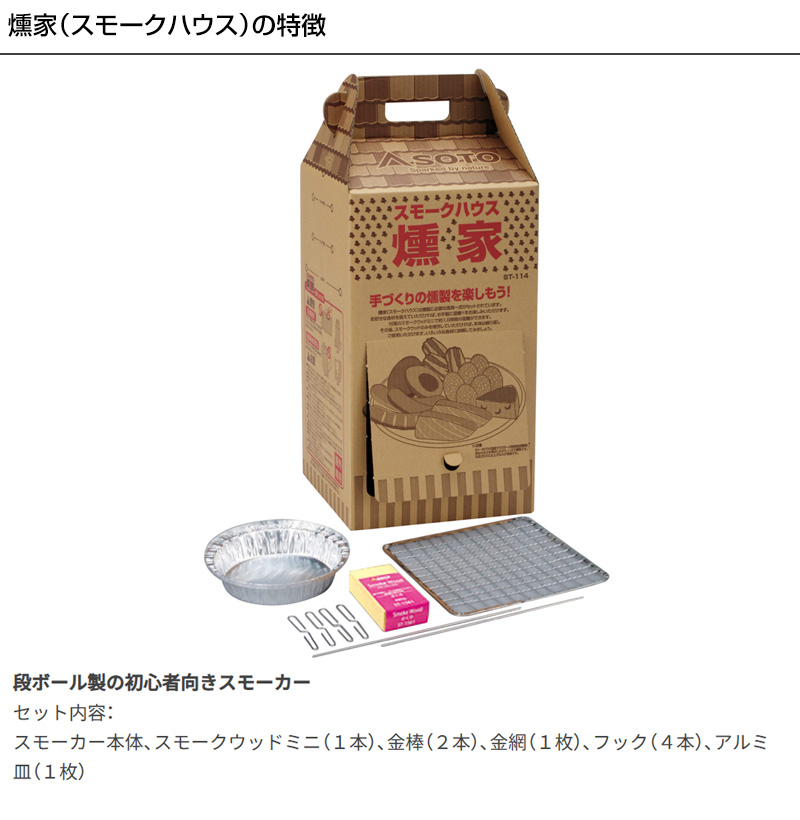 段ボール製の燻製器シリーズは温燻のみですが、リーズナブルな価格なので、燻製の入門用にも最適です。使い捨てではなく、繰り返し何度も使えます。段ボールは食材の余分な水分をしっかり吸収するという素材上のメリットもあります。