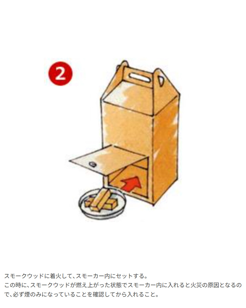 (2)スモークウッドに着火して、燻製器内にセットします。この時に、スモークウッドが燃え上がった状態で燻製器の中に入れないでください。必ず、煙のみになっていることを確認してから入れましょう。