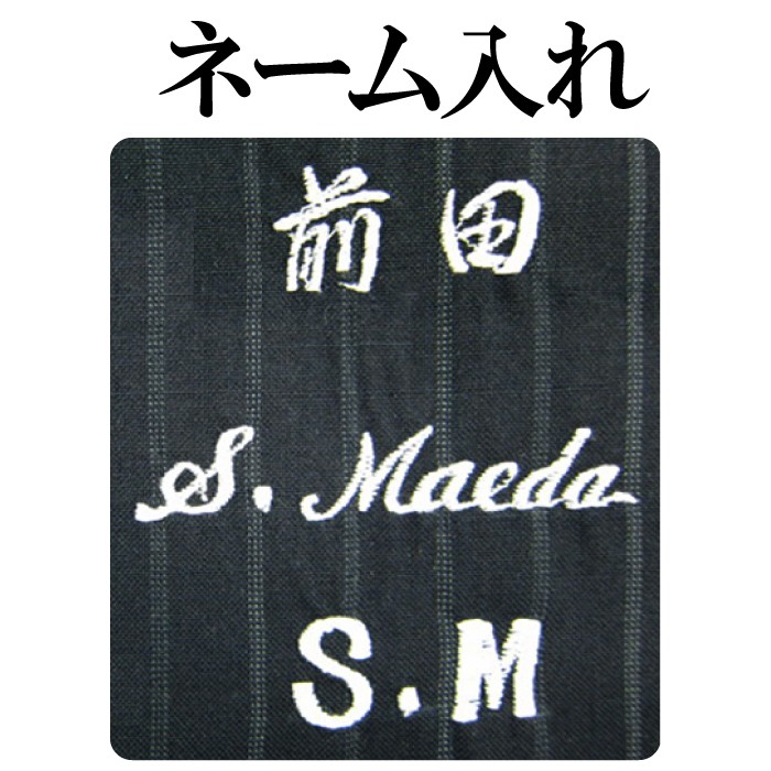 ◆上着の内ポケット下に横書きでネームをお入れします。「漢字」「ローマ字」「イニシャル」のいずれかを選択していただき、ご注文時に表示されるご要望欄にてご希望の内容をご指定ください。