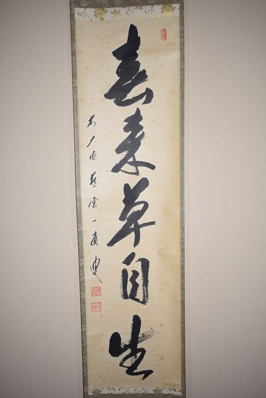 茶道具 掛軸 前大徳 蔵雲寺 矢野 一甫 「春来草自生」 掛け軸 01-7803 175.5×35.4cm シミ、折れ、色焼け、木箱の変色はありますが、本体はしっかりしています、お稽古にお使いになるには差し支えありません。