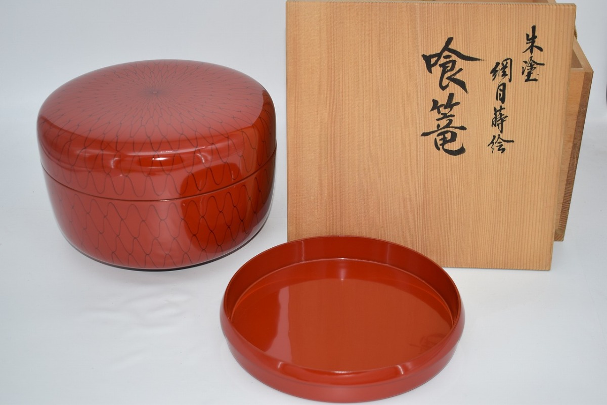 茶道具 菓子器 朱 網目 喰籠 掛子付 茶道 堀川 蒼雲 作 胴径21.8cm 高さ14.2cm 掛子:径20cm 高さ3.4cm 擦れ、木箱の汚れはありますが、本体はしっかりしています、お稽古にお使いになるには差し支えありません。