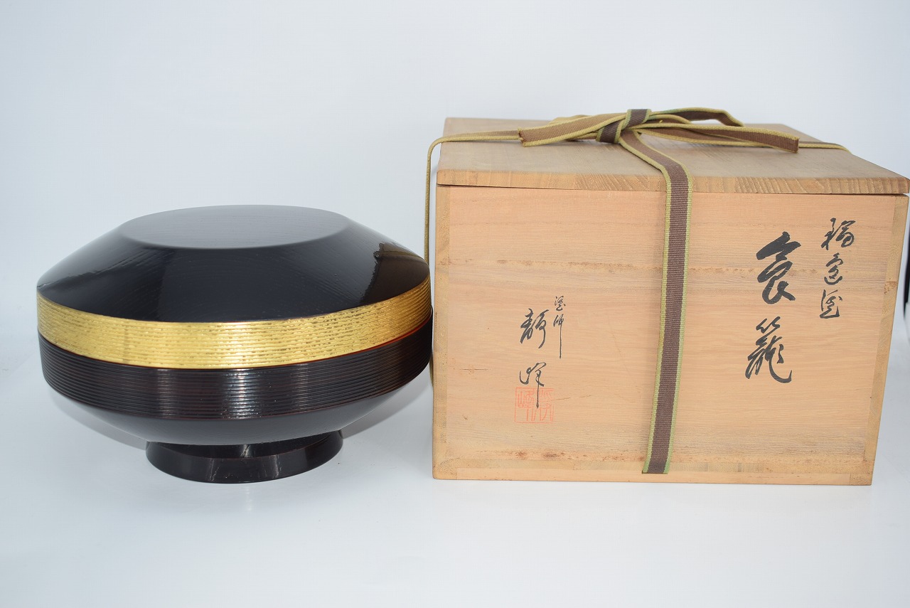 茶道具 菓子器 即中斎好 独楽 喰籠 大家 静峰 作 茶道 径23cm 高さ14.2cm 擦れ、木箱の汚れはありますが、本体はしっかりしています、お稽古にお使いになるには差し支えありません。