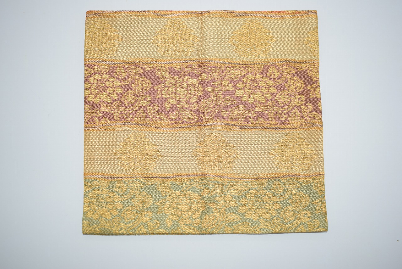 茶道具 古帛紗 段織牡丹唐草紋 古服紗 正絹 茶道 袱紗 33-8632 約15×15.9cm 折れ、シミ、汚れ、擦れがあります、素材としてお使いください。又お稽古にお使いになるには差し支えありません。 名物裂 敷物 帛紗 服紗 袱紗 テーブルセンター ドイリー (花瓶敷き)