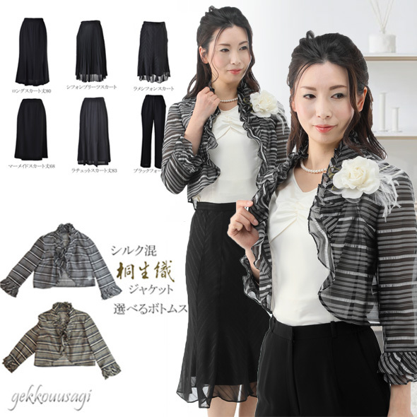 ボレロ感覚でお召いただける薄手素材ジャケットと選べるボトムスのセットスーツです。