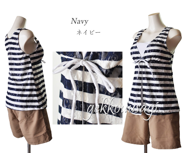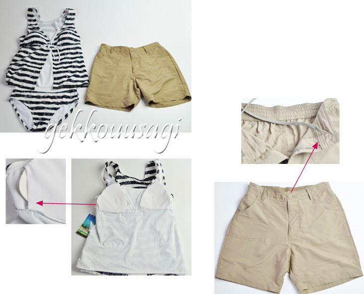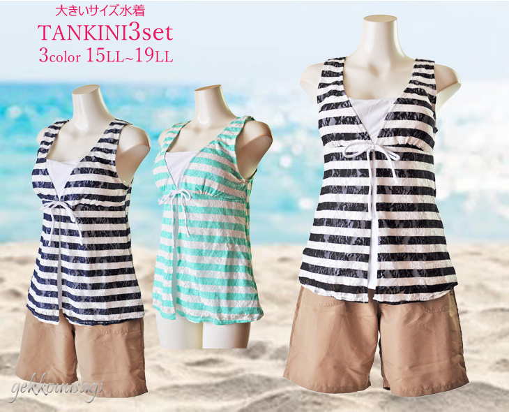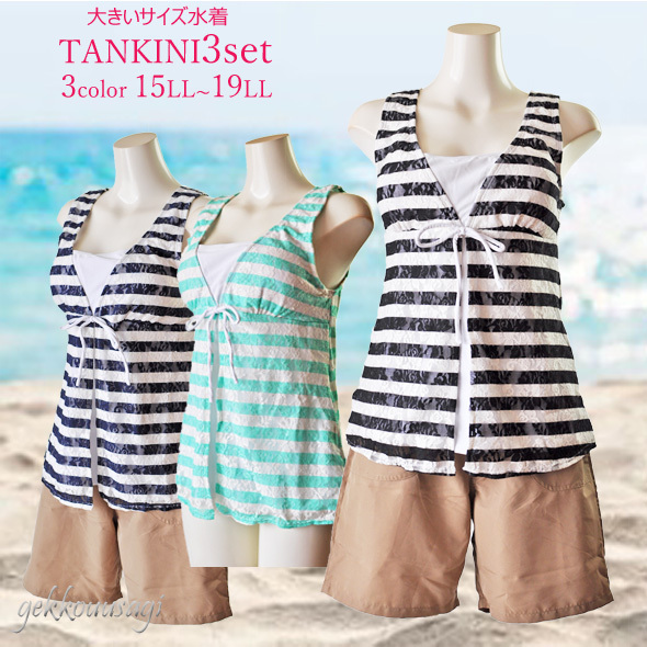 15号、17号、19号サイズのブラ一体型タンキニ、ショーツ、ショートパンツの3点セット水着です。