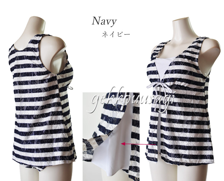 タンキニ水着は白色生地をベースに、花柄レースボーダー柄を合わせた女性らしいデザイン。