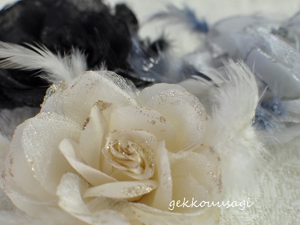 レースを使用した薔薇にラメを施し、羽付きで優雅に仕上げています。