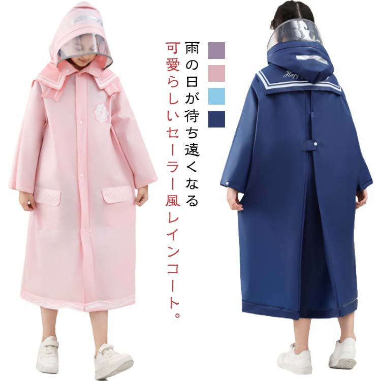 | 雨の日が待ち遠くなる可愛らしいセーラー風レインコート。 セーラーカラーが特徴的でかわいい女の子レインコート。 ランドセルやリュックを背負ったまま着られる小学生用レインコート。 フードは透明窓付きなので、視線を遮らず前方が見やすい。 フロントはファスナーとスナップボタンの2重設計、雨の侵入をしっかりシャットアウト。 ひざ下あたりまでのロング丈、レインブーツと合わせれば、しっかり全身をカバー! | |