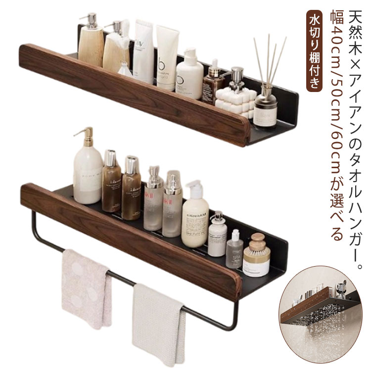 | 天然木×アイアンのタオルハンガー。【幅40cm/50cm/60cmが選べる】【水切り棚付き】 洗面用具、歯磨き、歯ブラシなど小物を置くのに大変便利です。 スチール×木目のシンプルデザイン ヴィンテージ風の質感を表現しました。 耐衝撃性や高い剛性を持ち、錆びることがなく、色落ちの心配も要らなく、長期に使用できます。 美しい木目と高級感溢れるアイアン棒の組み合わせ。 自宅、ホテルやレストラン等のいろんなところに大人気です! | |