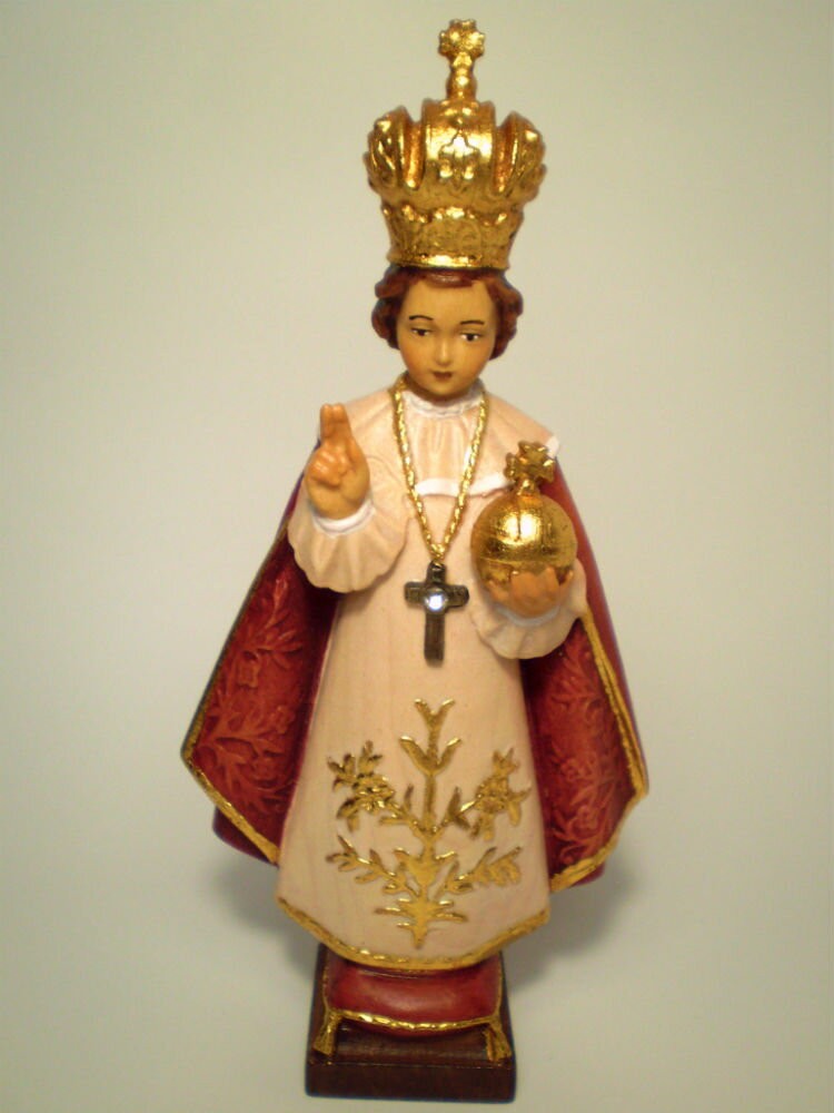 自然木から彫り出したフルカラーで温かみのある、木彫りイエスキリスト像「プラハの幼子」。