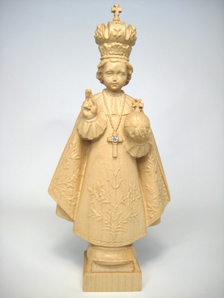自然木から彫出した白木にニス塗り仕上げで温かみのある、木彫りイエスキリスト像「プラハの幼子」。